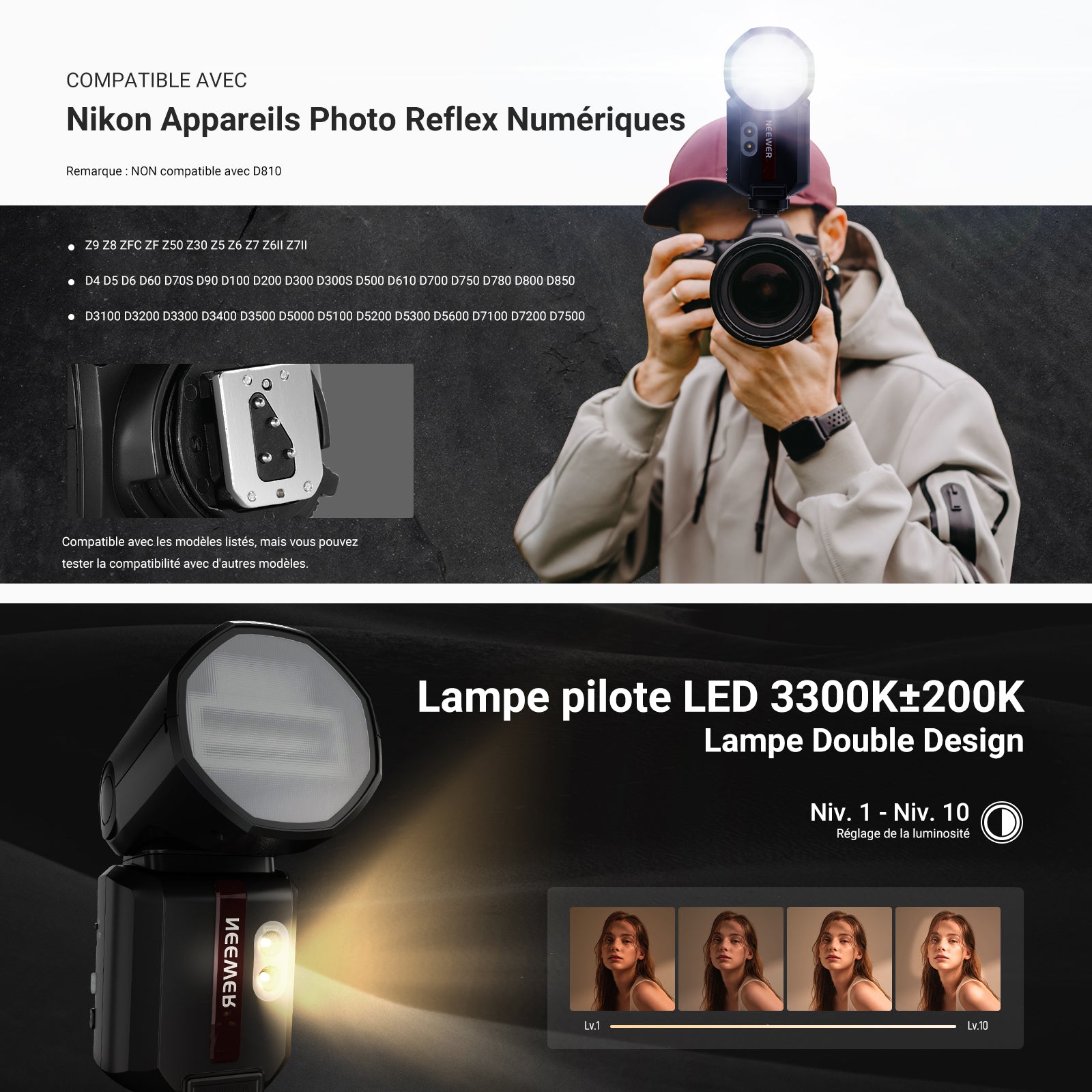 - Speedlite professionnel 100Ws- Doté d'une puissance de 100Ws et d'un HSS 1/8000s, le flash NEEWER compatible avec Nikon capture les sujets en mouvement rapide et les portraits en contre-jour. Compatible avec la synchronisation sur le rideau avant/arrière, il offre jusqu'à 100 flashs consécutifs à pleine puissance (plage focale de 8 à 105mm).