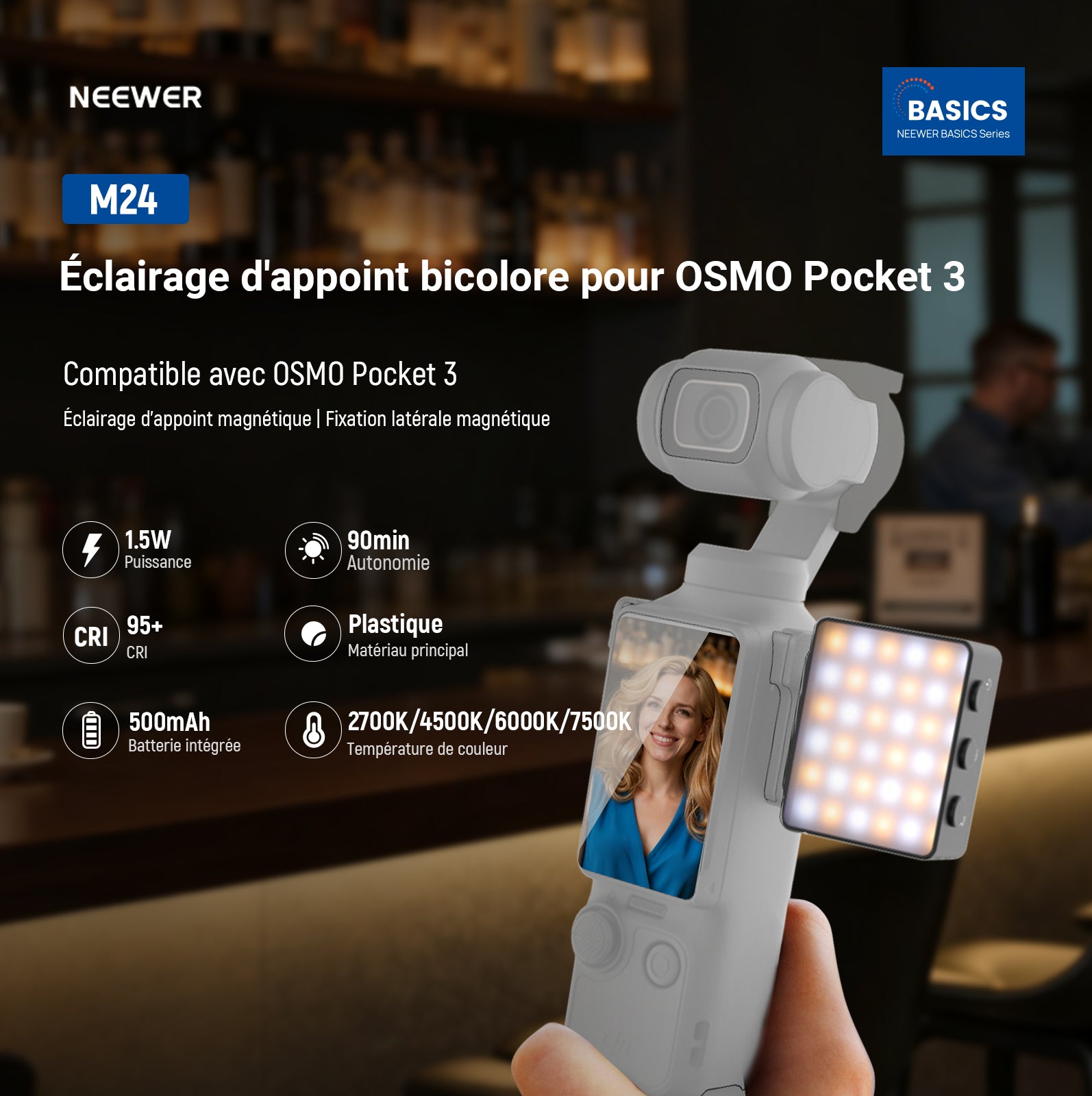- 【Éclairage personnalisable】 Le petit éclairage d'appoint LED NEEWER M24, compatible avec DJI OSMO Pocket 3 caméra stabilisée et Creator Combo accessoires, offre 4 modes de température de couleur et 4 niveaux de luminosité pour répondre à tous vos besoins. Un CRI élevé de 95 garantit des couleurs précises pour vos photos.