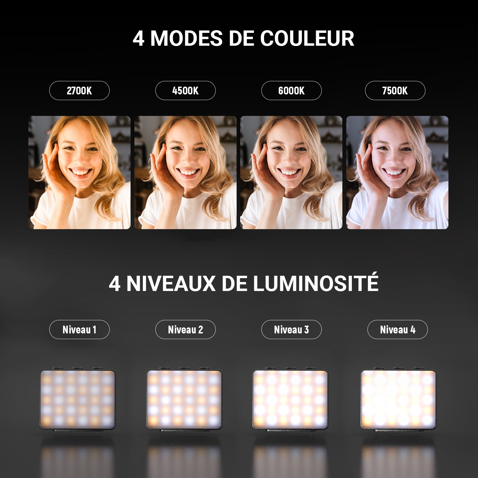 - Température de couleur : 2700K / 4500K / 6000K / 7500K