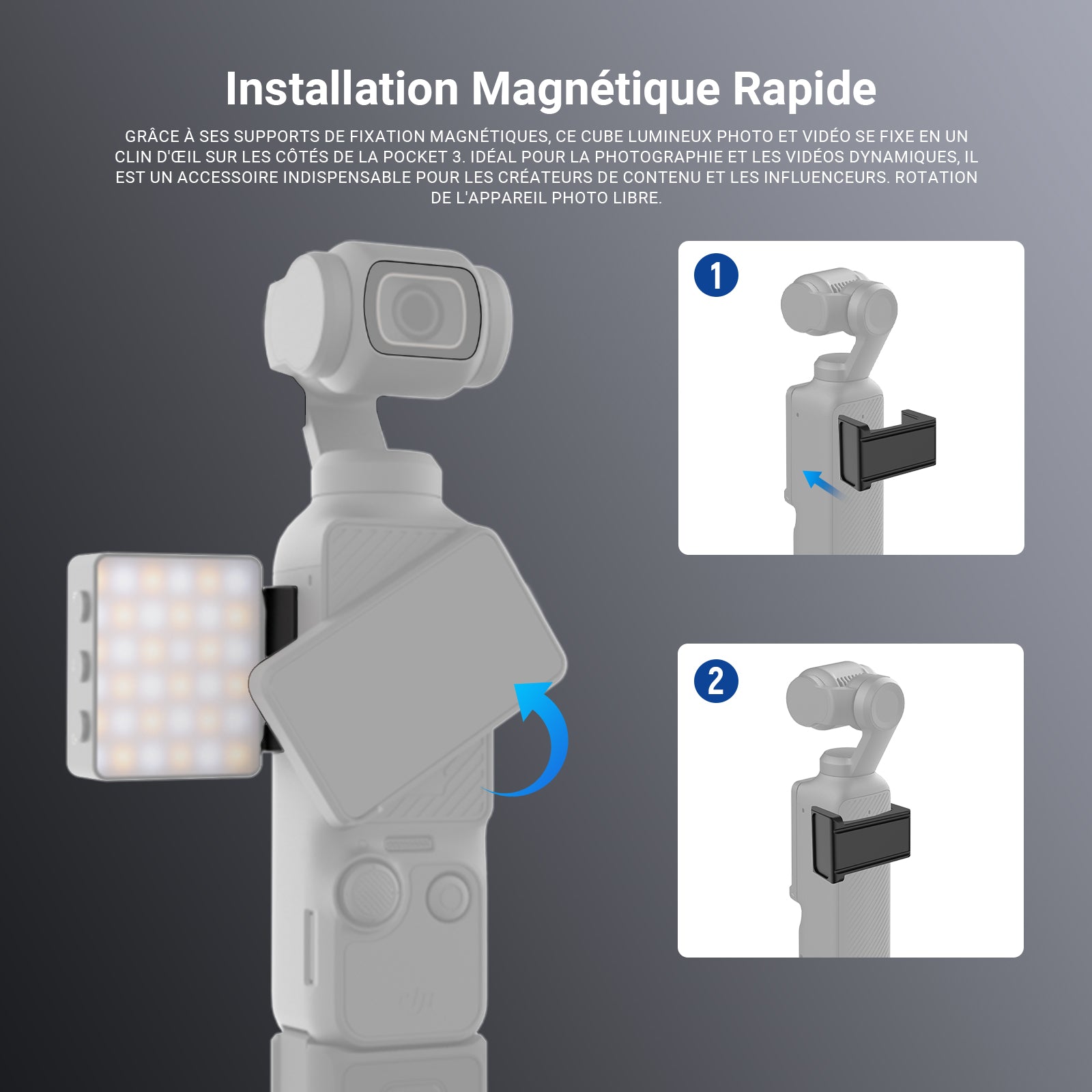 - 【Installation magnétique rapide】Grâce à son support magnétique, ce cube lumineux photo et vidéo se fixe en un clin d'œil sur les côtés de votre sac Pocket3. Idéal pour la photographie et les vidéos dynamiques, c'est l'accessoire indispensable des créateurs de contenu et des influenceurs.