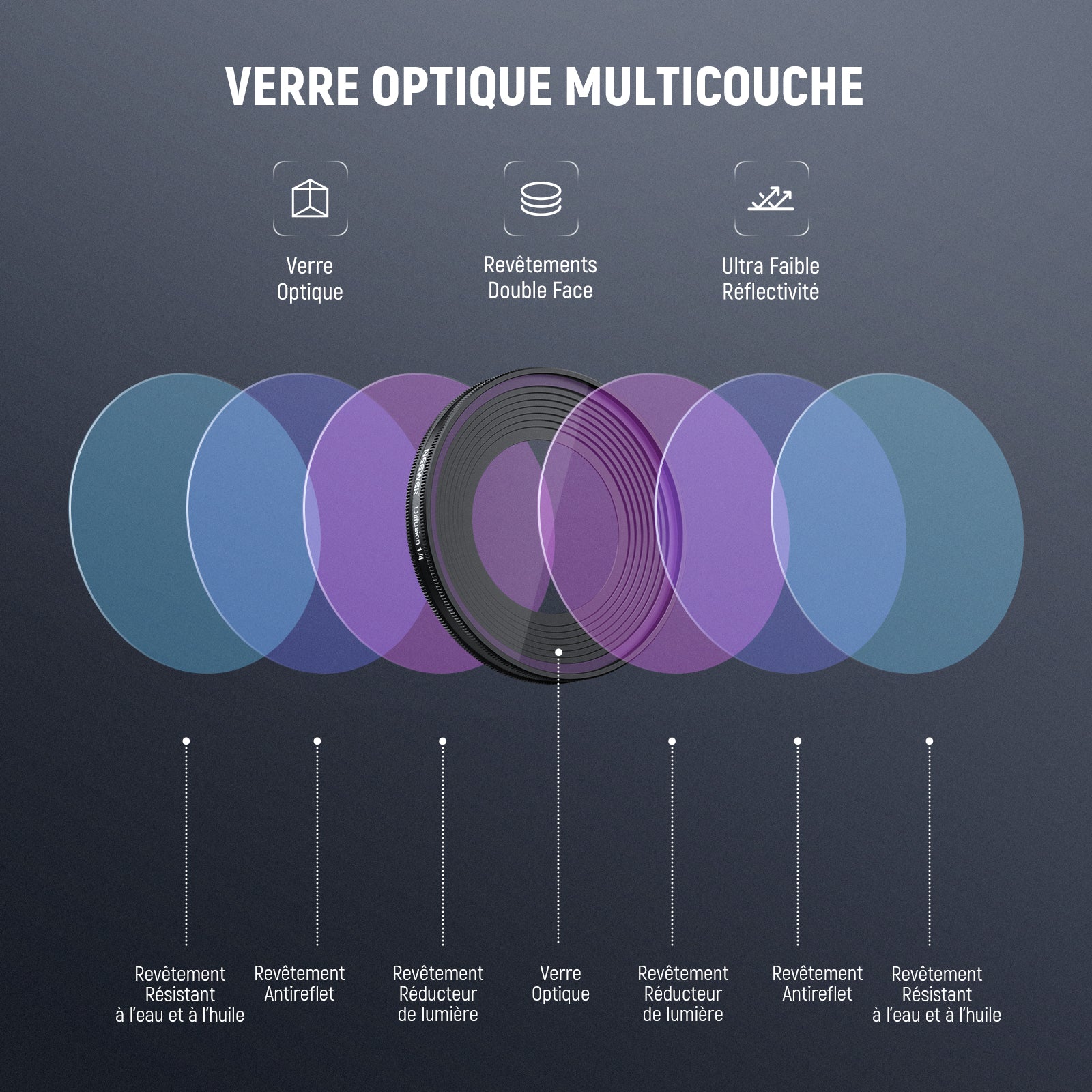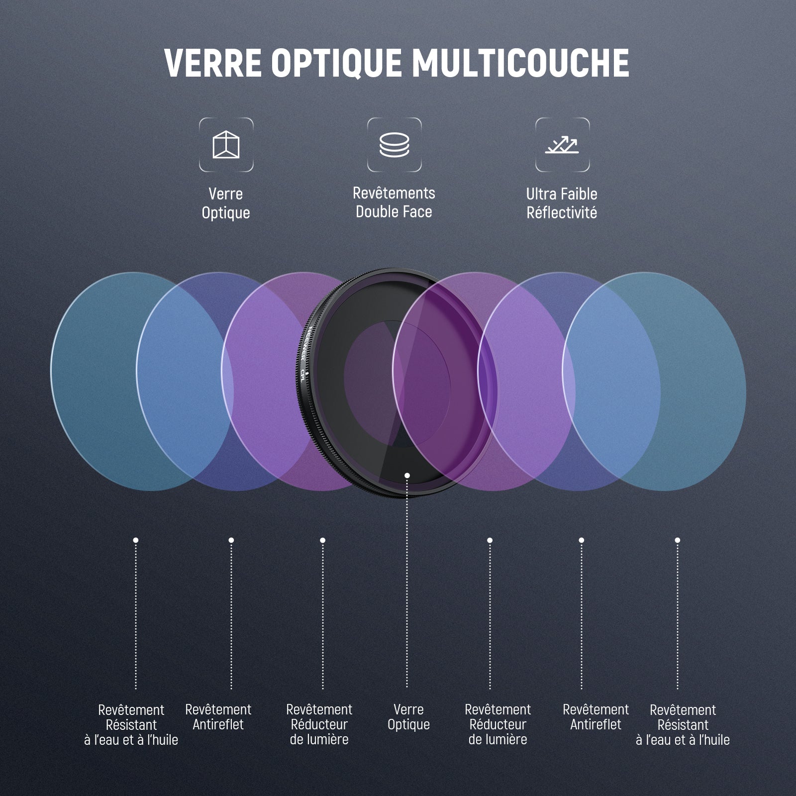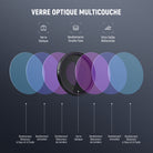 - Verre optique multicouche – Le verre optique avec plusieurs revêtements protecteurs offre une image claire tout en résistant à l’eau, aux empreintes digitales et aux rayures.
