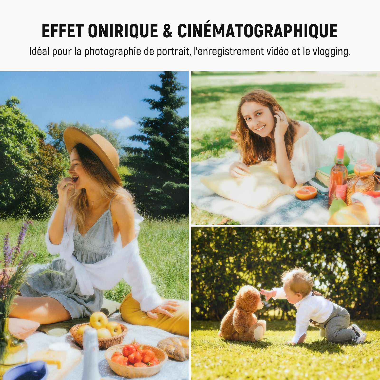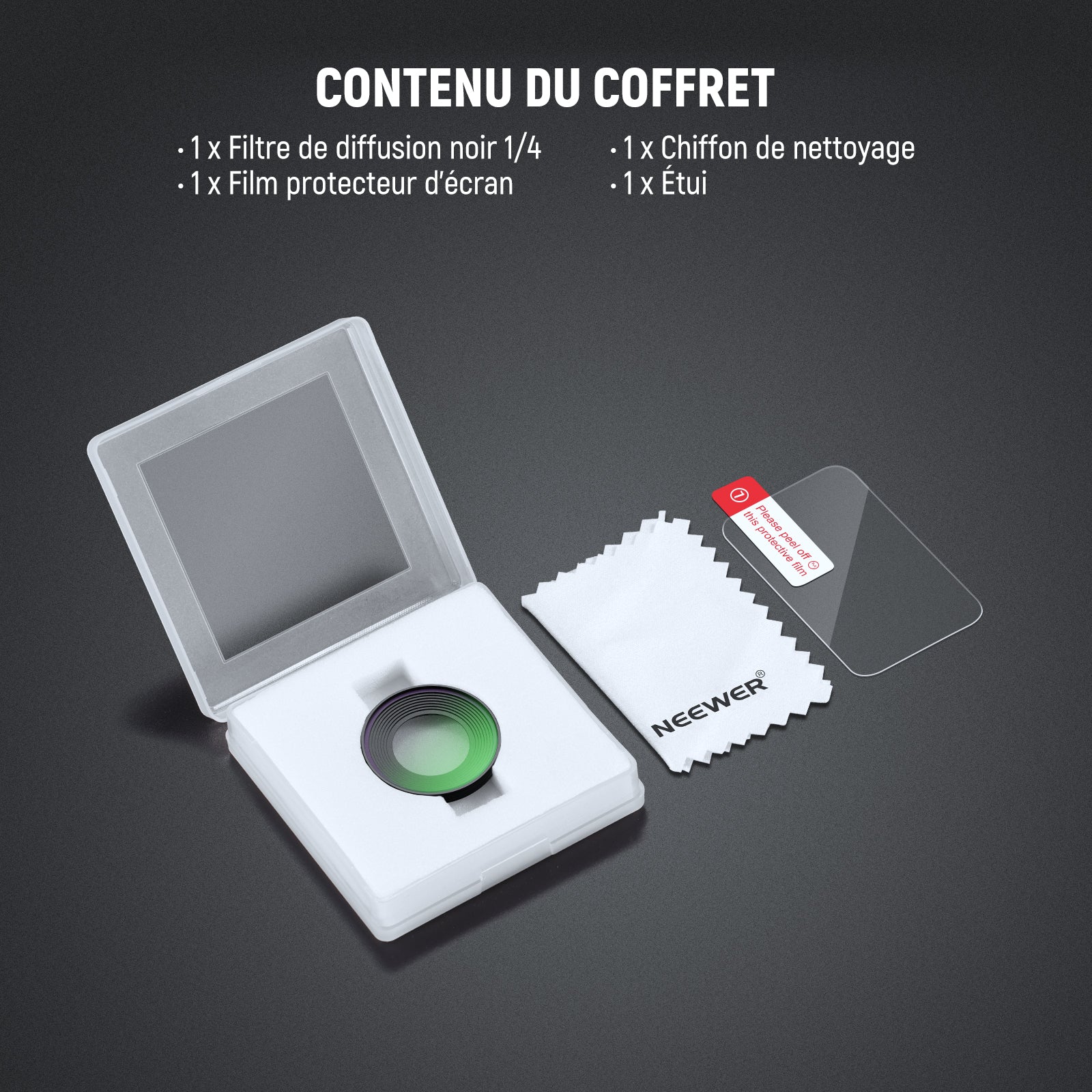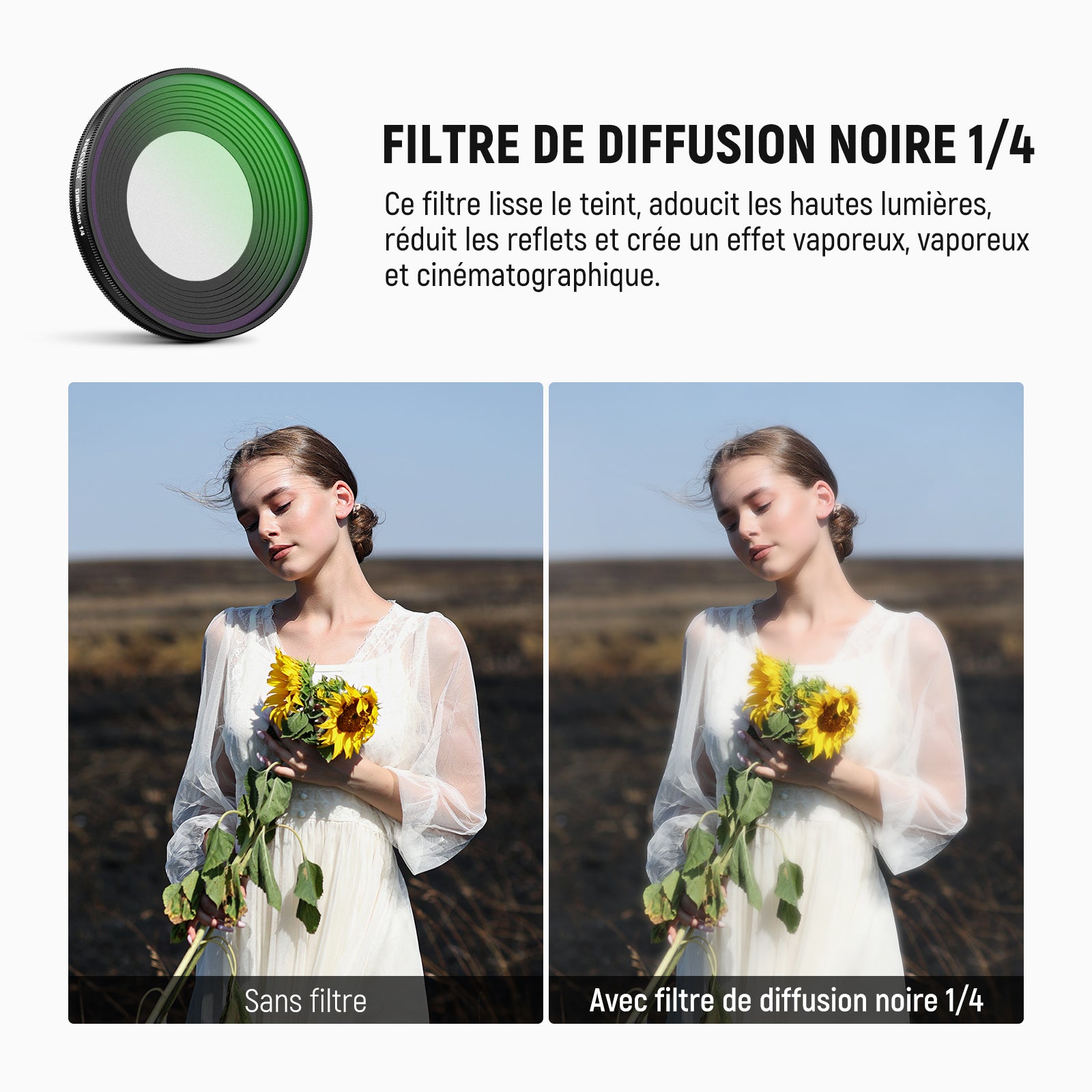 - Effet cinématographique diffus – Le filtre noir diffusion 1/4 lisse le teint de la peau et ajoute un effet cinématographique et onirique aux portraits, selfies et vlogs personnels.