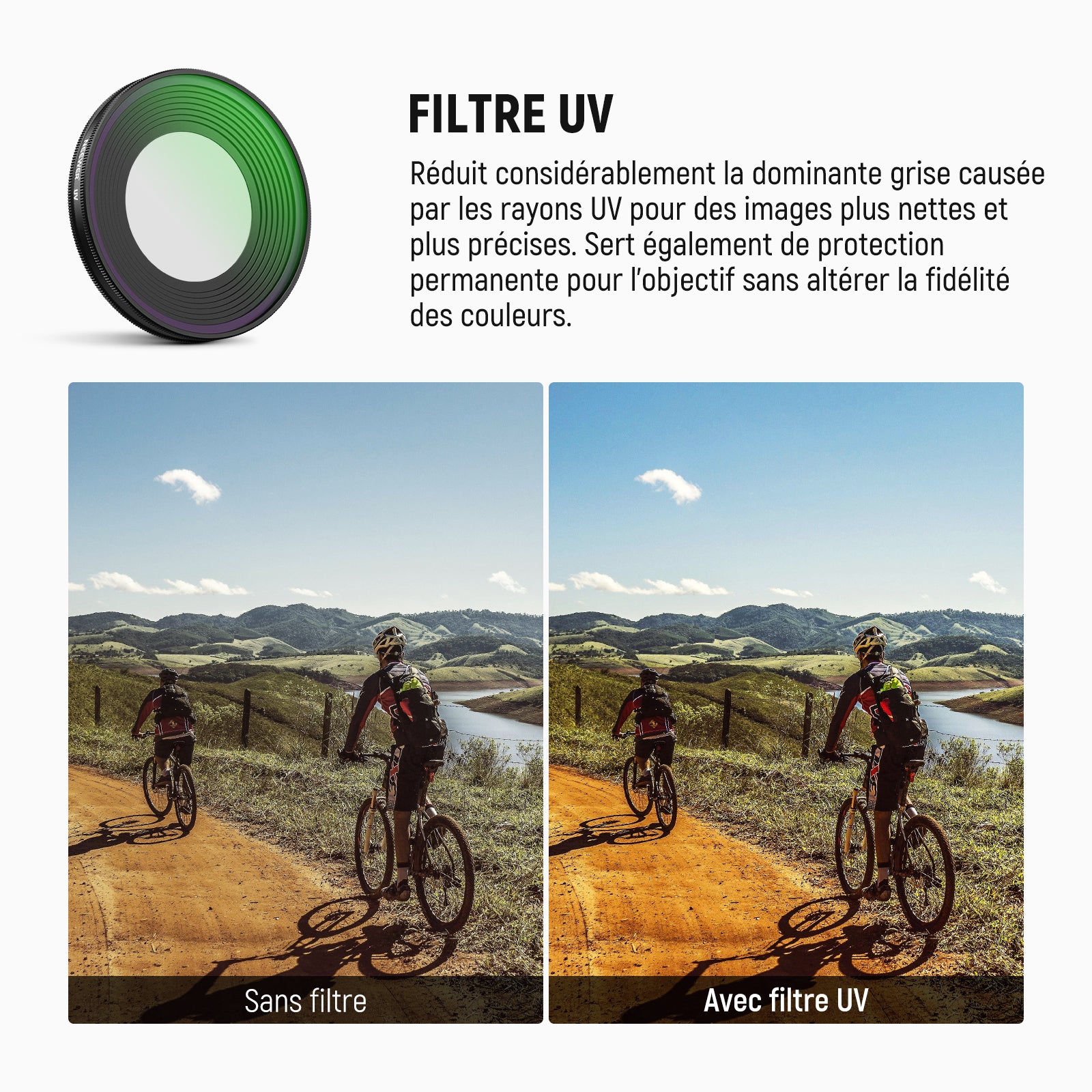 - Élimine la brume et les rayons UV – Le filtre UV protège l’objectif de la caméra tout en bloquant la brume et les rayons UV sans affecter la précision des couleurs.