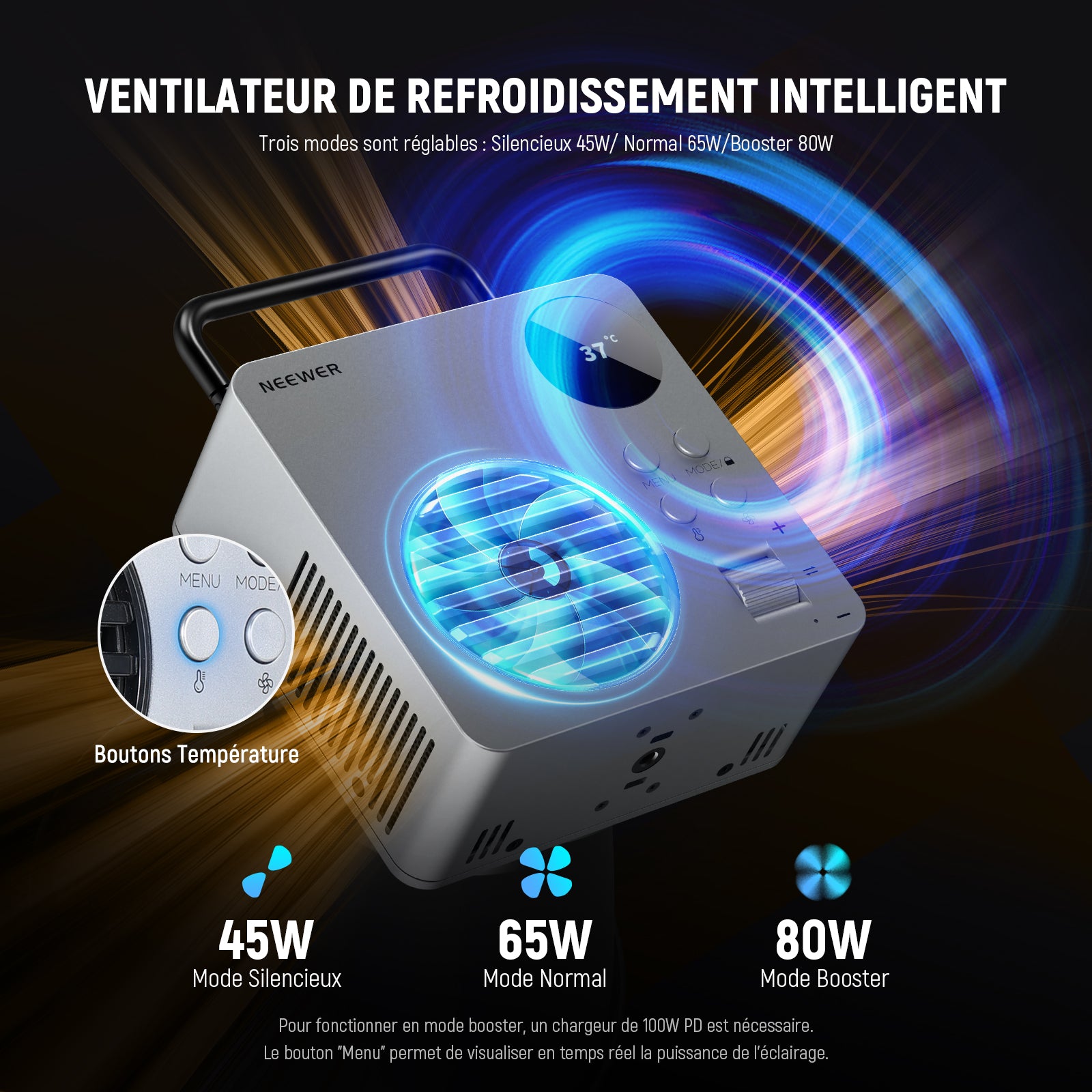 - 【3 Modes de Ventilation & Charge Rapide USB C PD】 Le ventilateur de refroidissement possède 3 modes : Silencieux (45W)/Normal (65W)/Booster (80W). Le mode Silencieux dure environ 1h30 et le mode Normal dure 1h10 à 100% de luminosité ; le mode Booster nécessite un chargeur 100W PD (vendu séparément). Le port bidirectionnel USB C supporte une entrée 100W PD et une sortie 65W PD, charge complète en 2h lorsqu'il est alimenté en 65W PD ou plus, vous pouvez utiliser l'éclairage pendant la charge
