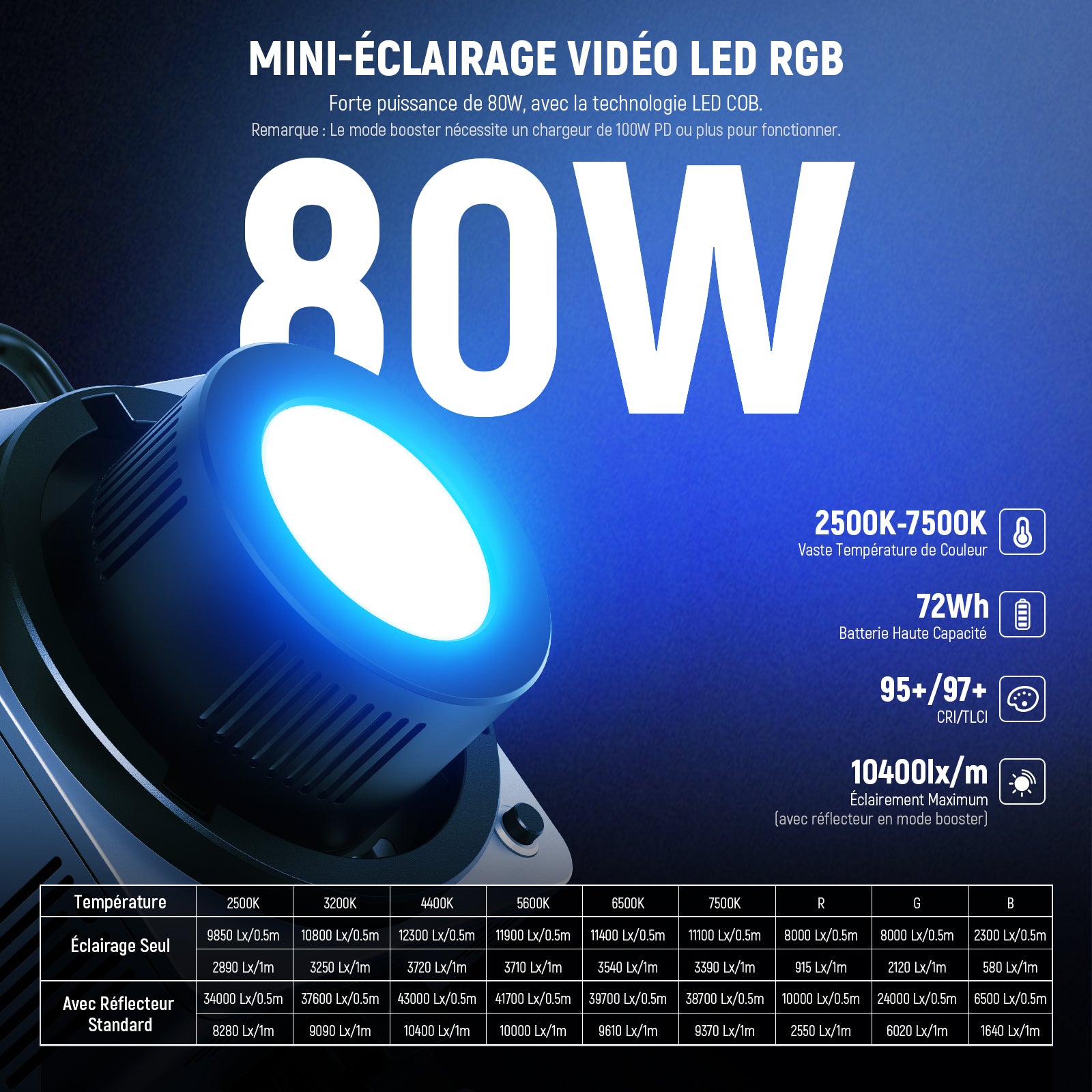 - 【Éclairage LED COB RGB 80W avec Batterie 72Wh】 Le HB80C est un mini projecteur RGB de 80W, avec une chambre de mélange pour restituer uniformément les couleurs RGB, une température de couleur de 2500-7500K, un GM ±50, un CRI élevé de 95+, une luminosité de 0-100% et un mode booster 4400K offrant un éclairement de 3720lux/m avec la lampe seule ou 10400lux/m lorsqu'elle est utilisée avec un réflecteur. L'autonomie max. de la batterie est de 70min en mode normal et 94min en mode silencieux