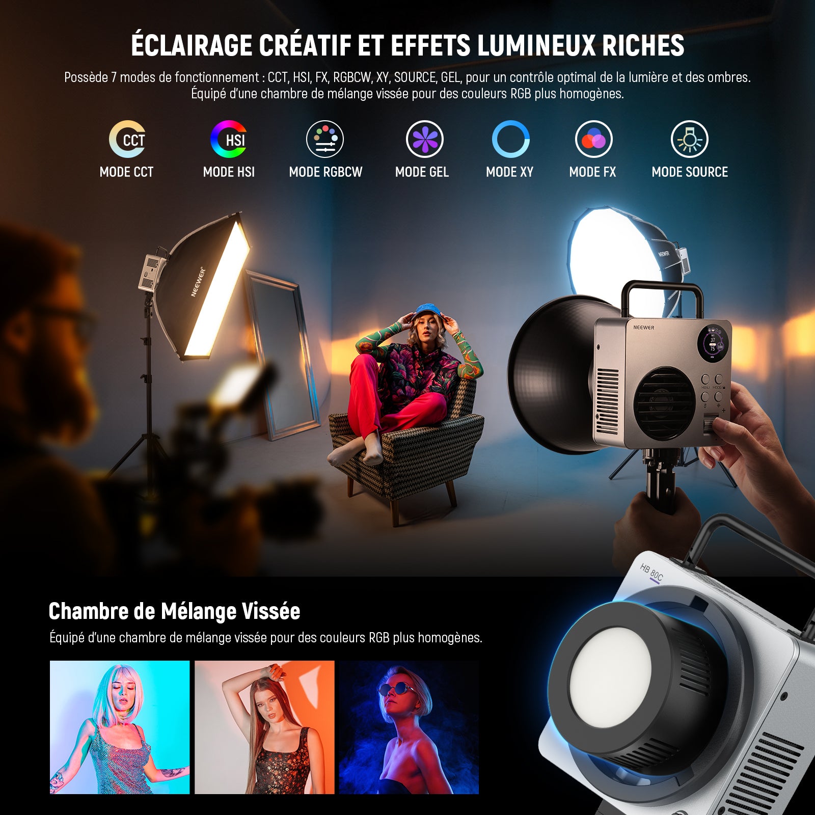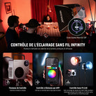 - Mode d'éclairage : CCT/HSI/RGBCW/XY/GEL/Source Match/FX