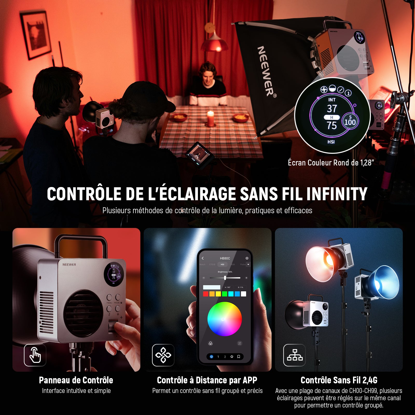 - 【App Infinity & Contrôle Sans Fil 2,4G】 La technologie NEEWER Infinity intégrée prend en charge à la fois le contrôle par App et la communication sans fil 2,4G pour réaliser la fonctionnalité maître/esclave. Lorsqu'il est réglé sur le même canal (00-99), le HB80C peut se synchroniser avec d'autres éclairages NEEWER 2,4G, facilitant ainsi un contrôle groupé pratique et efficace