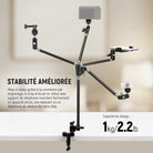- Stabilité et flexibilité améliorées : la construction améliorée avec connexion à engrenage et un bras articulé en métal avec support de téléphone portable permet une fixation stable des caméras, webcams ou téléphones portables (max. 1 kg) au-dessus de la tête. La pince Super C et trois points de pivot assurent une fixation et une stabilité sûres. La structure multi-têtes sphériques permet un positionnement flexible, et la conception intégrée ne nécessite aucun montage. Un outil indispensable pour les créateurs de contenu et les influenceurs