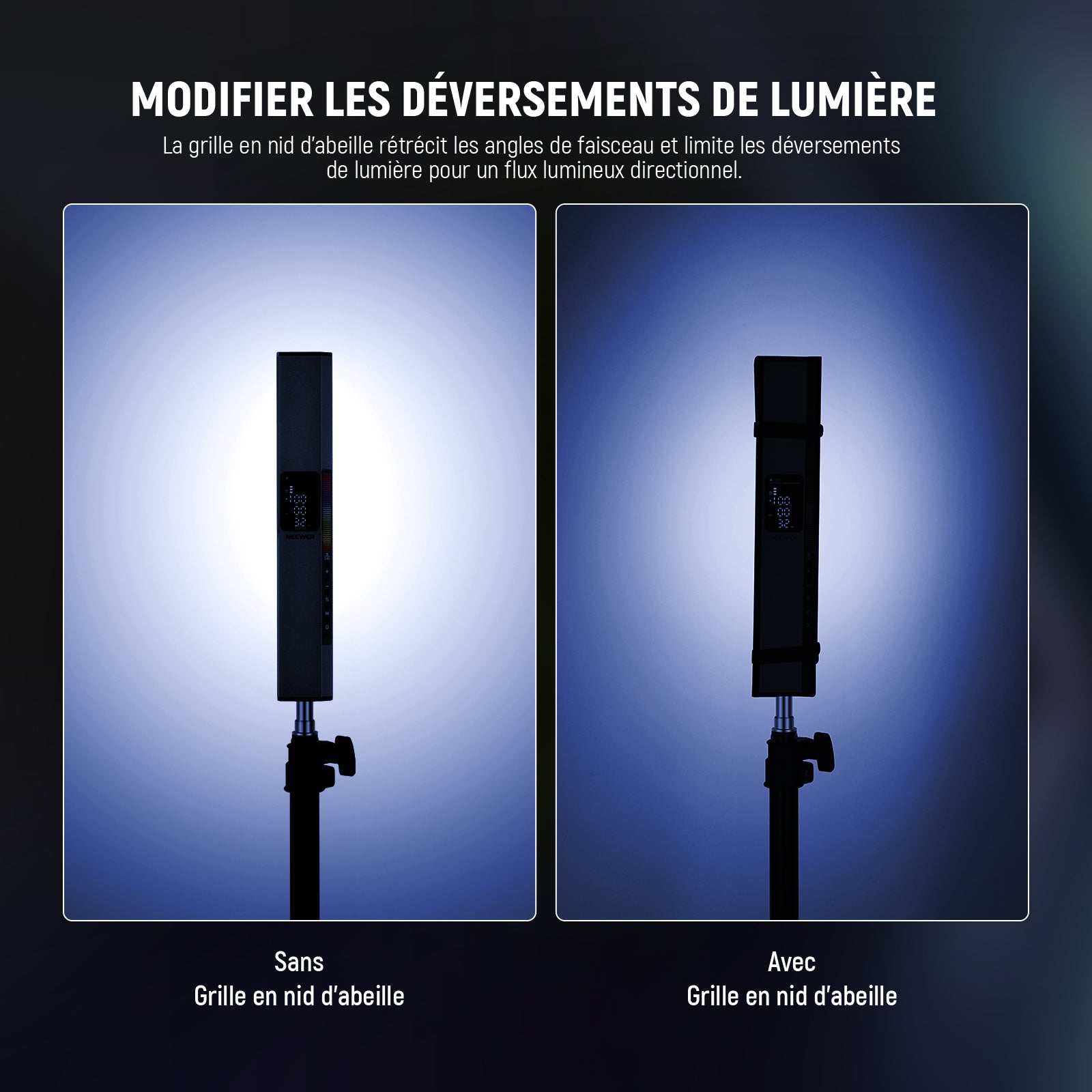 - 【Lumière directe et contraste amélioré】La grille lumineuse réduit efficacement l'angle du faisceau, empêche les déversements de lumière et améliore le contraste pour la prise de photos, l'enregistrement vidéo ou la réalisation de films.