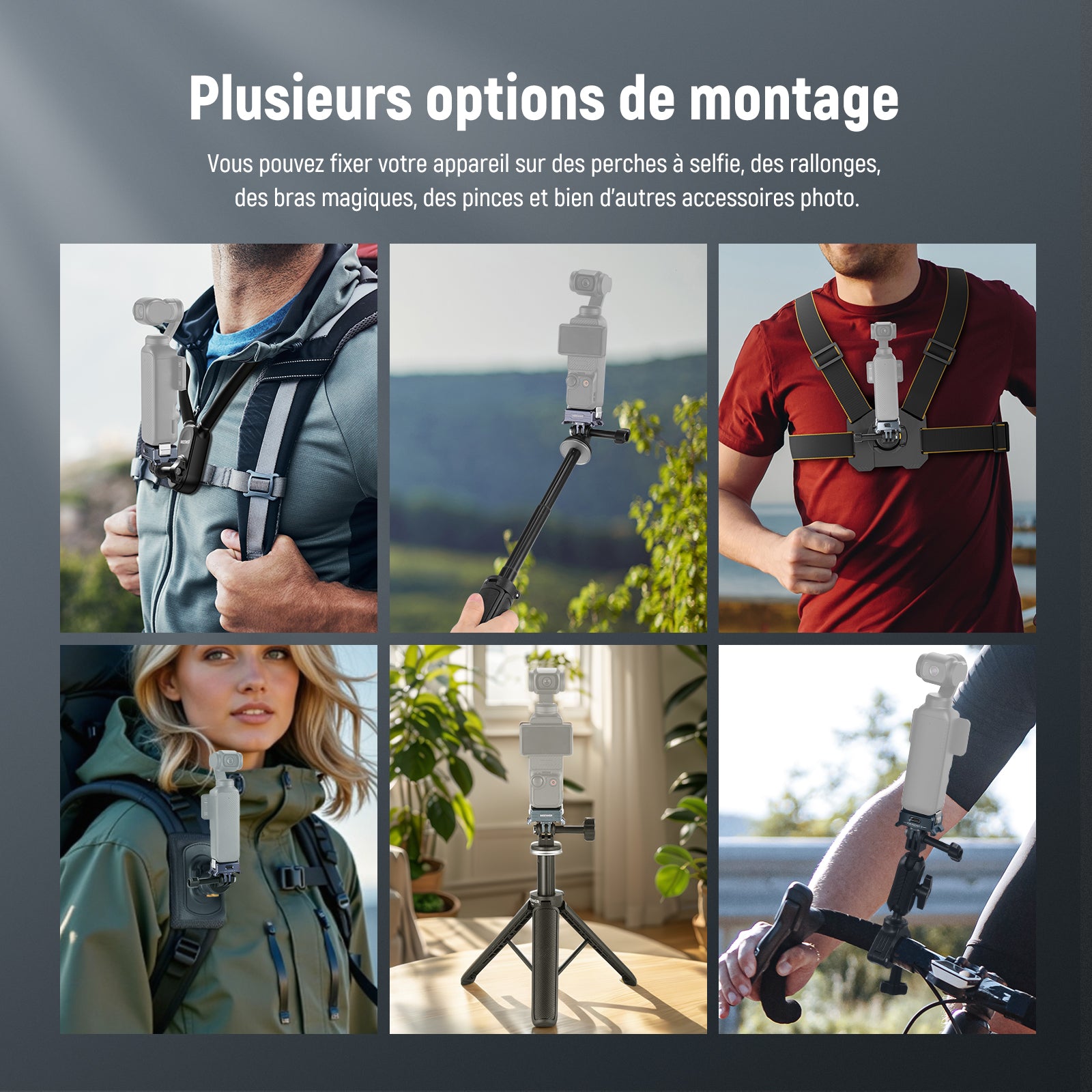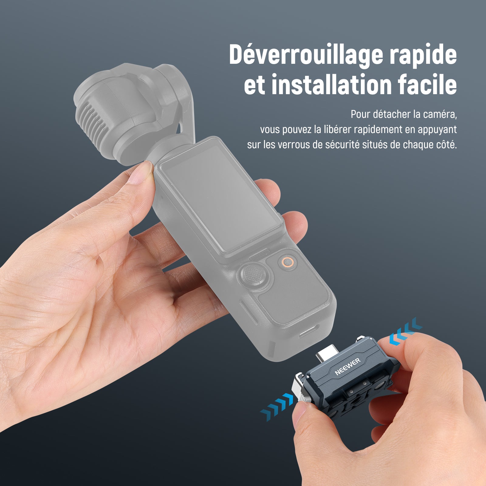 - Libération rapide et installation facile : pour fixer solidement votre caméra à cardan sur le support de base Pocket 3, appuyez simplement dessus par le haut. Quand il est temps de détacher la caméra, vous pouvez rapidement la libérer en appuyant sur les verrous de sécurité des deux côtés