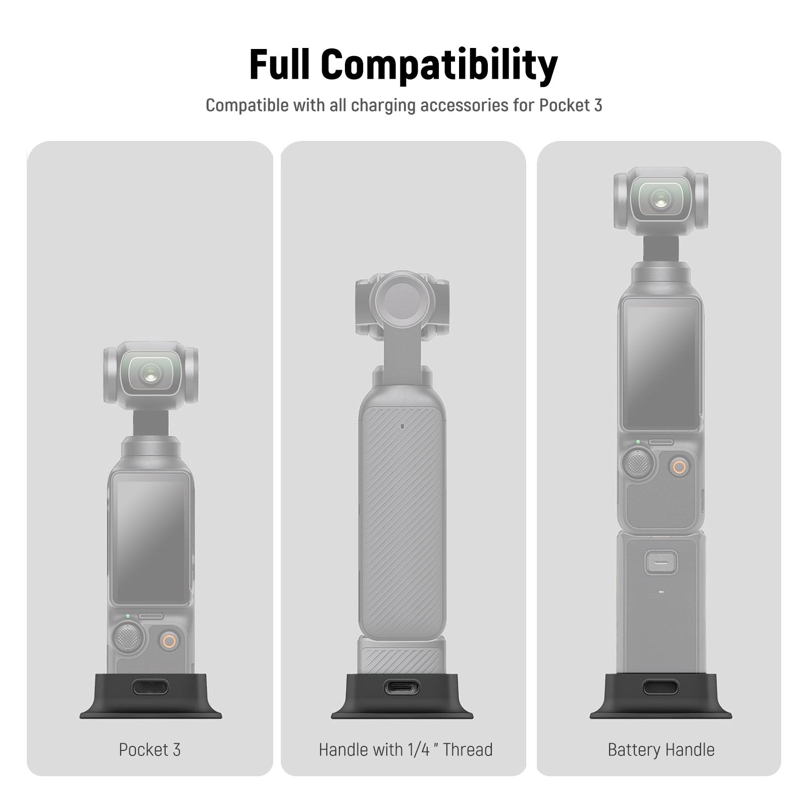 - Unhindered Charging- Keeps the USB Type C charging port fully accessible for interrupted charging. Note: Using the base may affect compatibility with certain accessories from the Pocket 3 Creator Combo