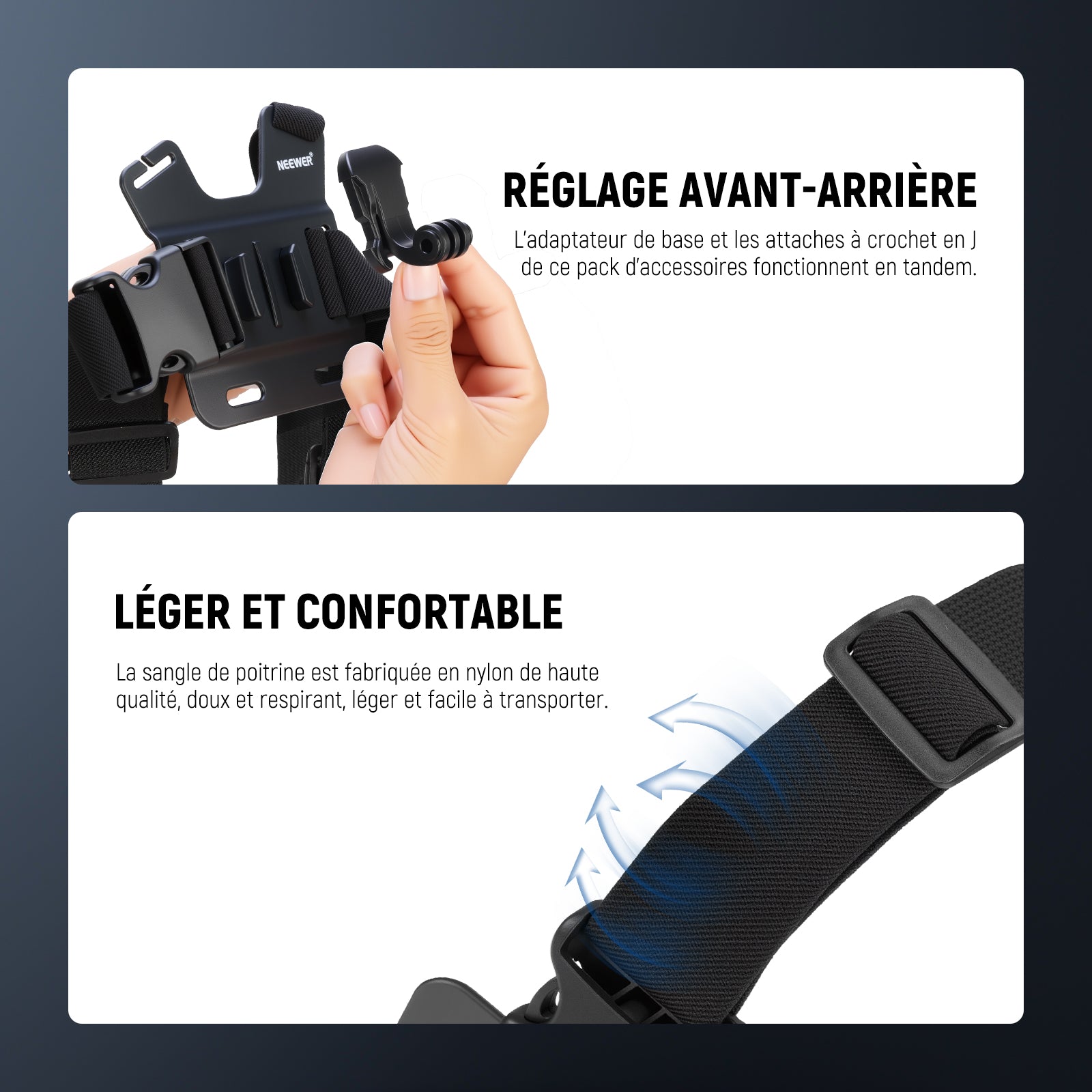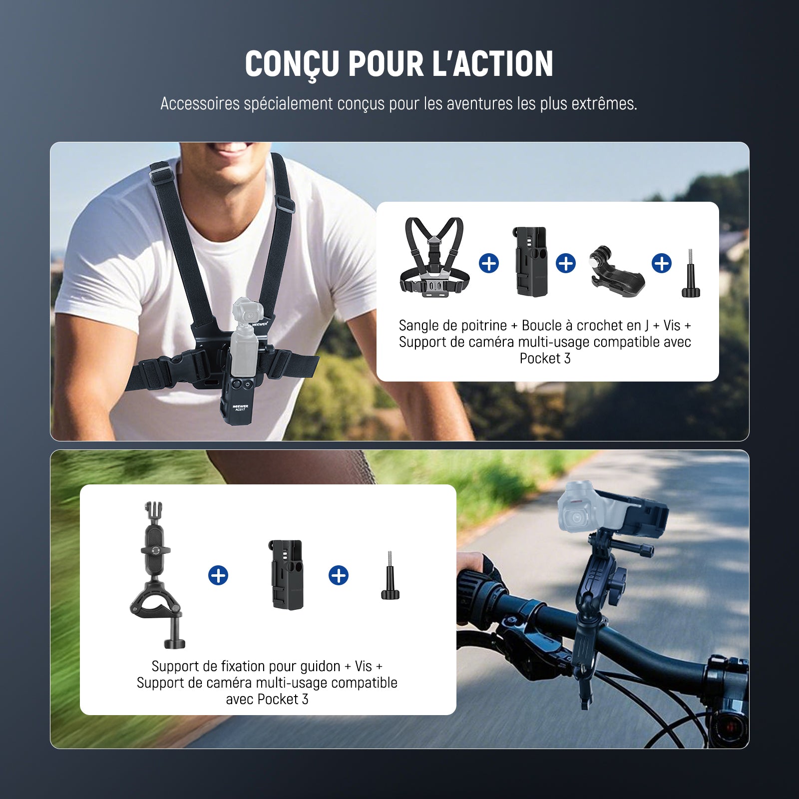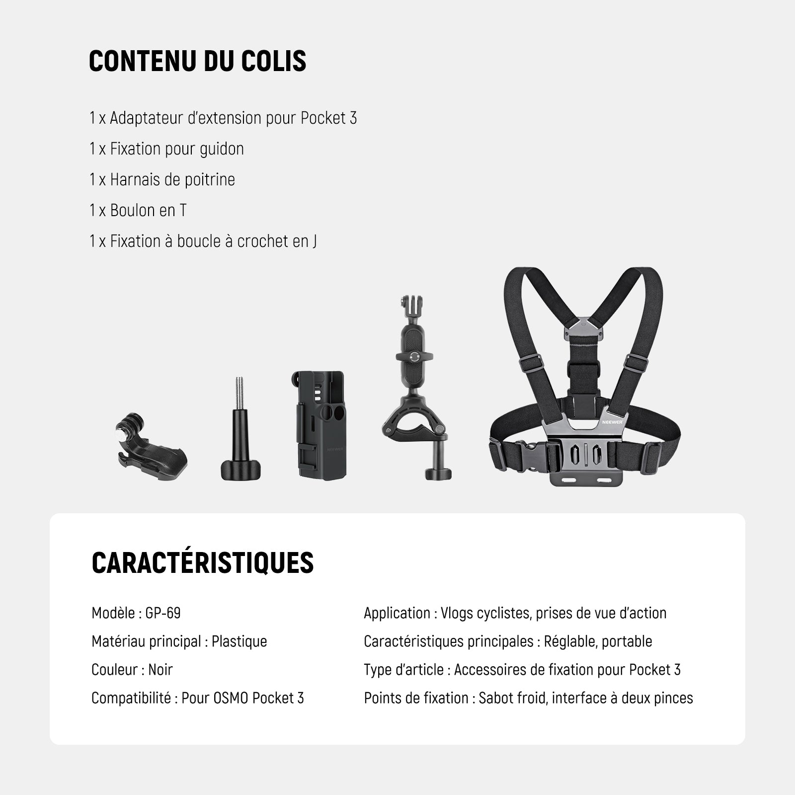 - 【Portable pour des prises de vue nomades】Une fois fixé à votre poitrine ou à votre guidon, ce kit de fixation pour Pocket 3 vous permet de capturer des images immersives de paysages en déplacement, sans avoir à tenir la caméra. Concentrez-vous sur votre création pour une expérience de prise de vue sans effort, que ce soit à vélo, en VTT, en randonnée, etc