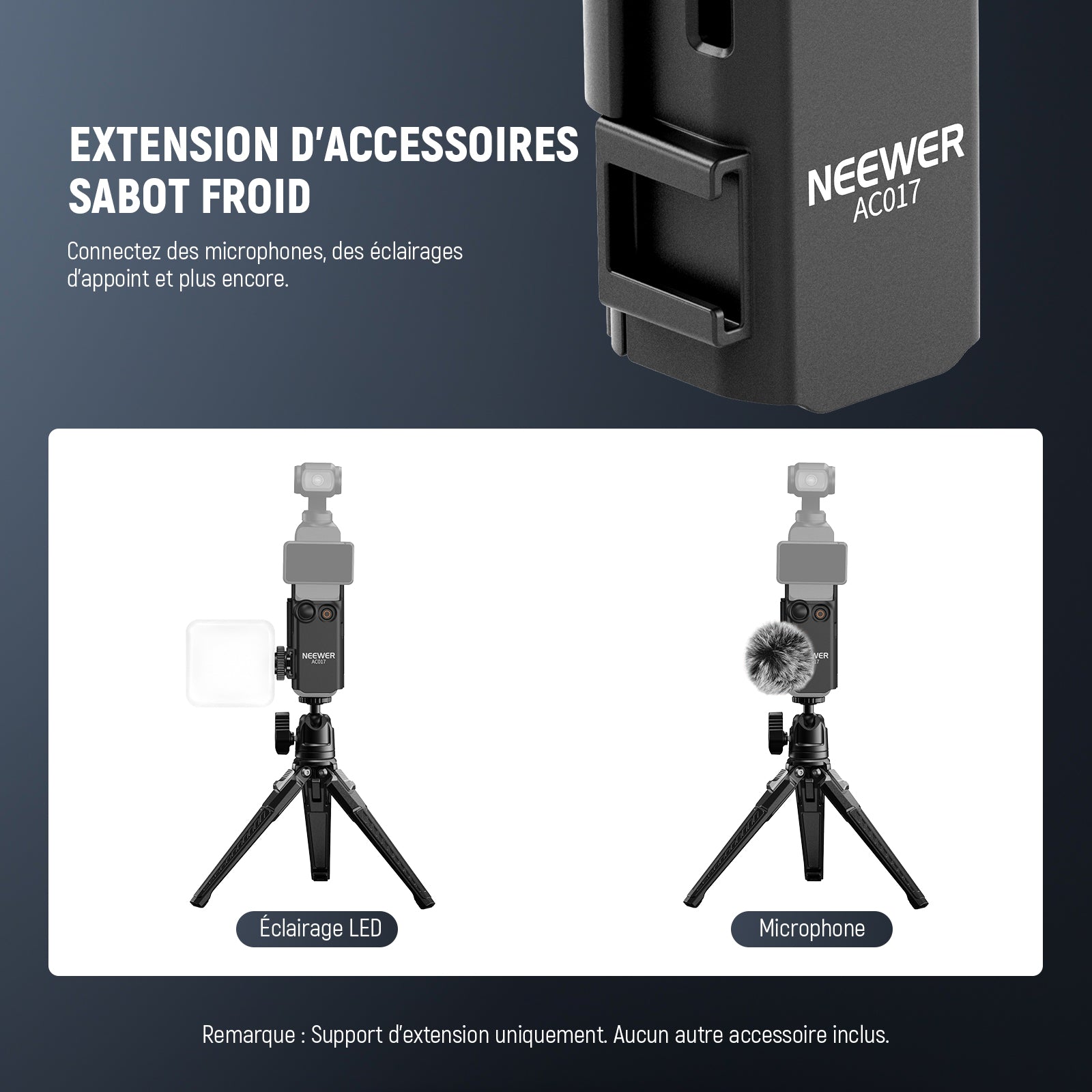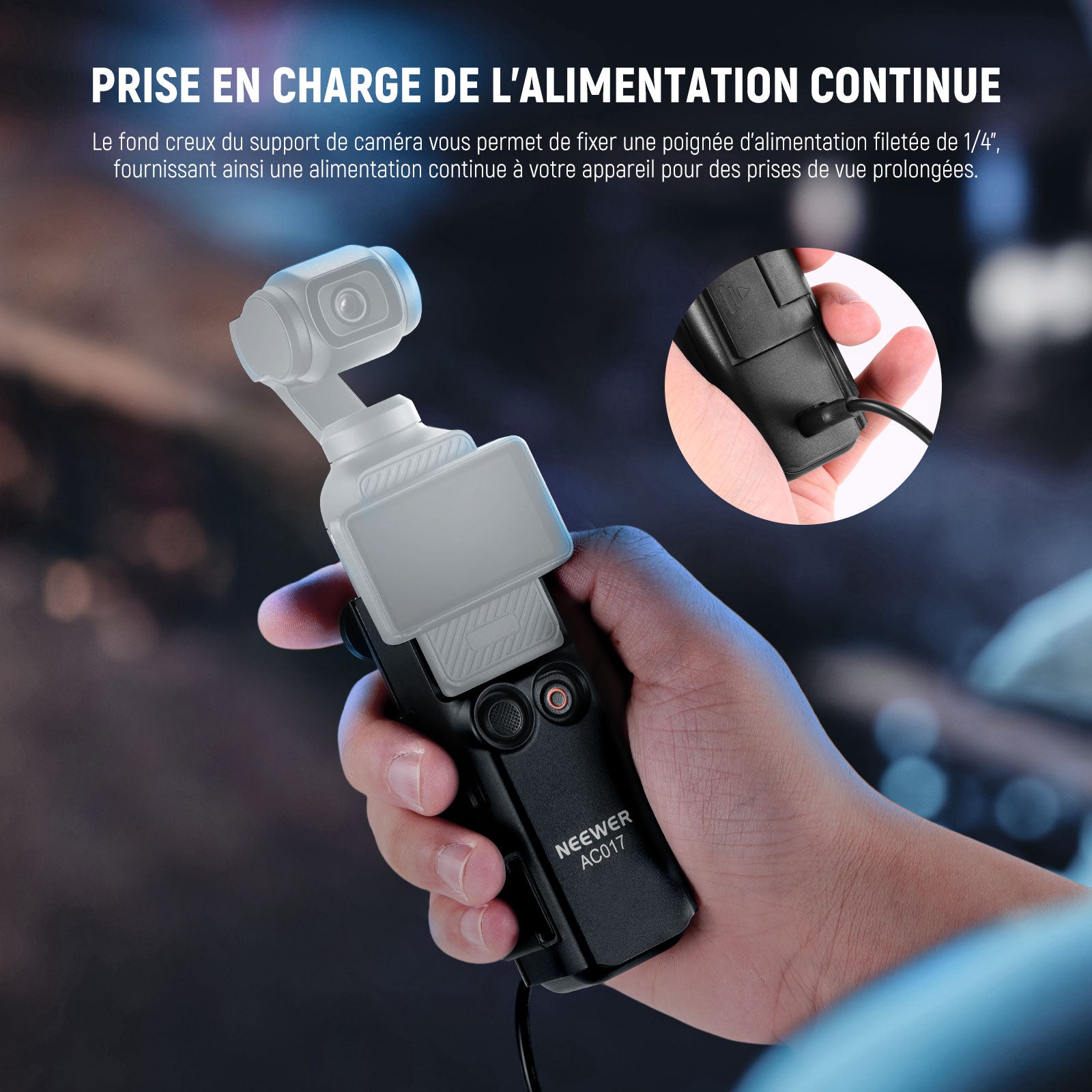 - 【Alimentation continue avec poignée de batterie】 Le support adaptateur pour Pocket 3 est doté d'une base creuse permettant de fixer une poignée de batterie pour une alimentation continue lors de séances de prise de vue prolongées. La griffe porte-accessoires facilite la fixation d'un microphone ou d'autres accessoires, élargissant ainsi vos possibilités créatives pour des contenus de qualité professionnelle