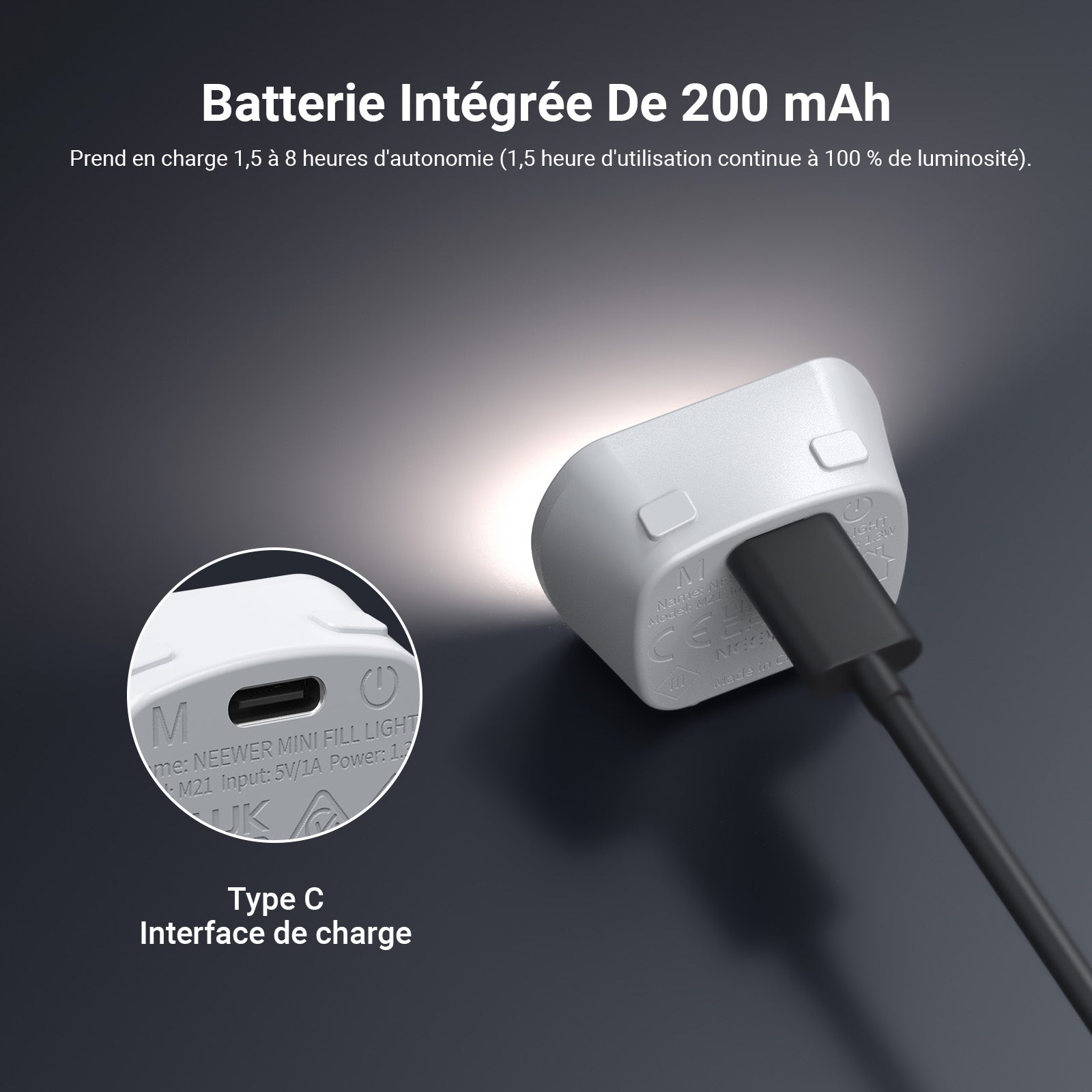 - 【Batterie intégrée de 200 mAh】Le mini panneau lumineux LED NEEWER offre une autonomie de 1,5 à 8 heures (dont 1,5 heure en éclairage continu à pleine luminosité) pour des séances photo prolongées. Il se recharge facilement avec un chargeur portable ou une autre source d'alimentation USB via le port USB-C.