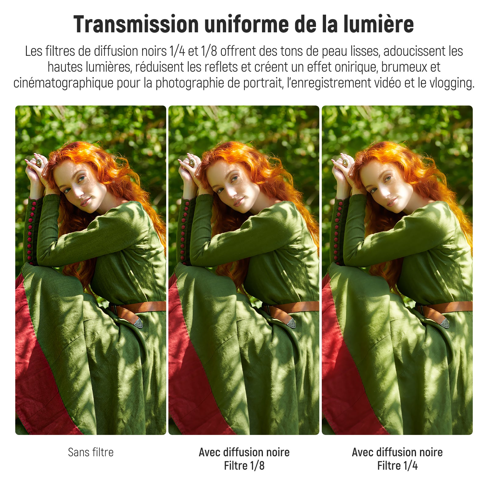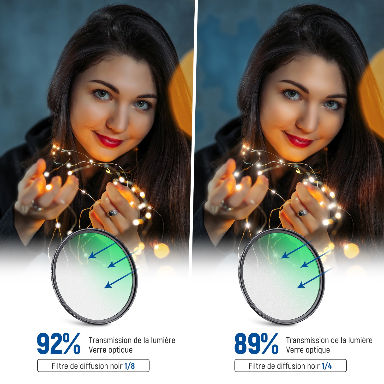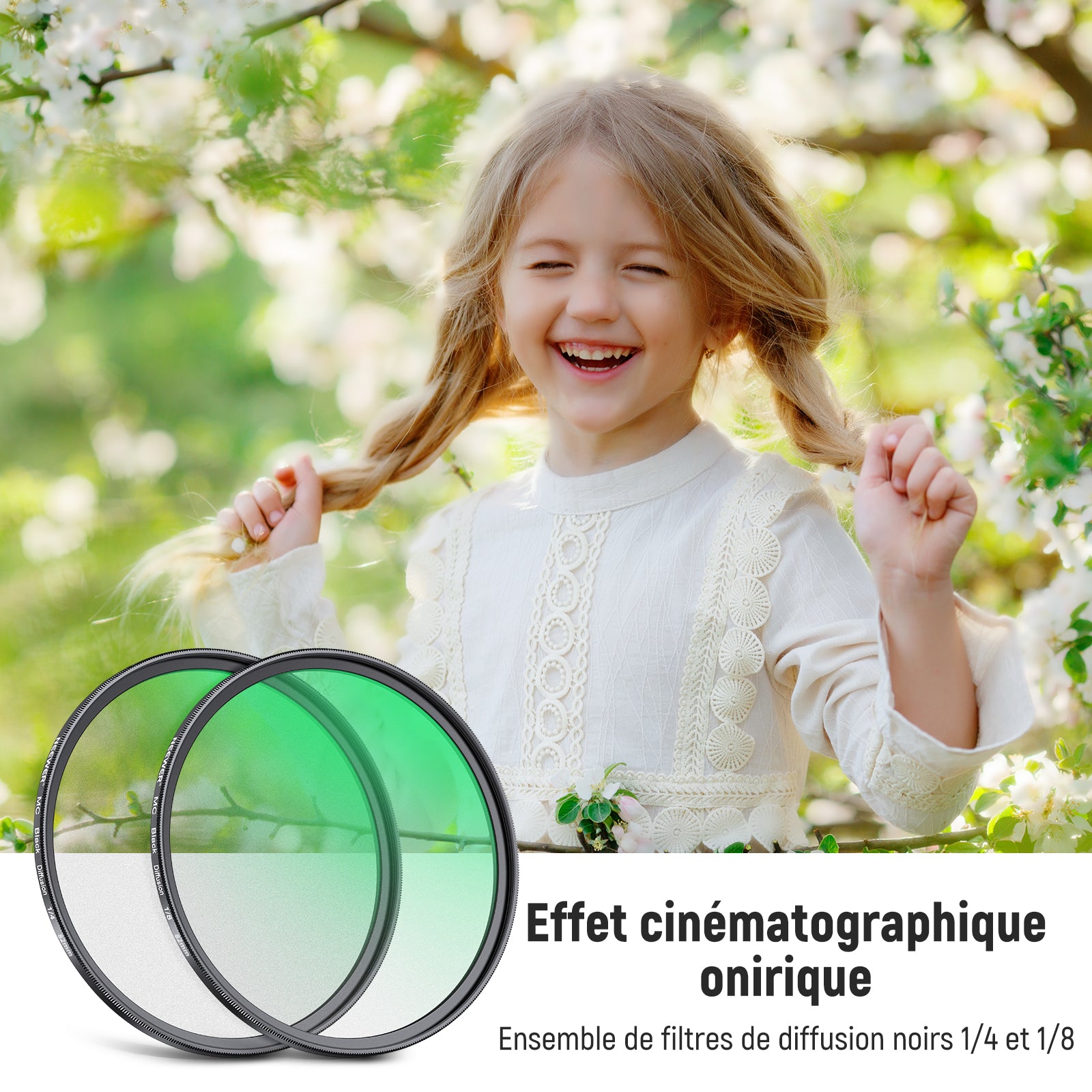 • 【Ensemble de filtres de diffusion noirs 1/4 et 1/8】 Les filtres de diffusion noirs 1/4 et 1/8 offrent des tons de peau lisses, adoucissent les reflets, réduisent l'éblouissement et créent un effet rêveur, brumeux et cinématographique pour la photographie de portrait, l'enregistrement vidéo et le vlogging