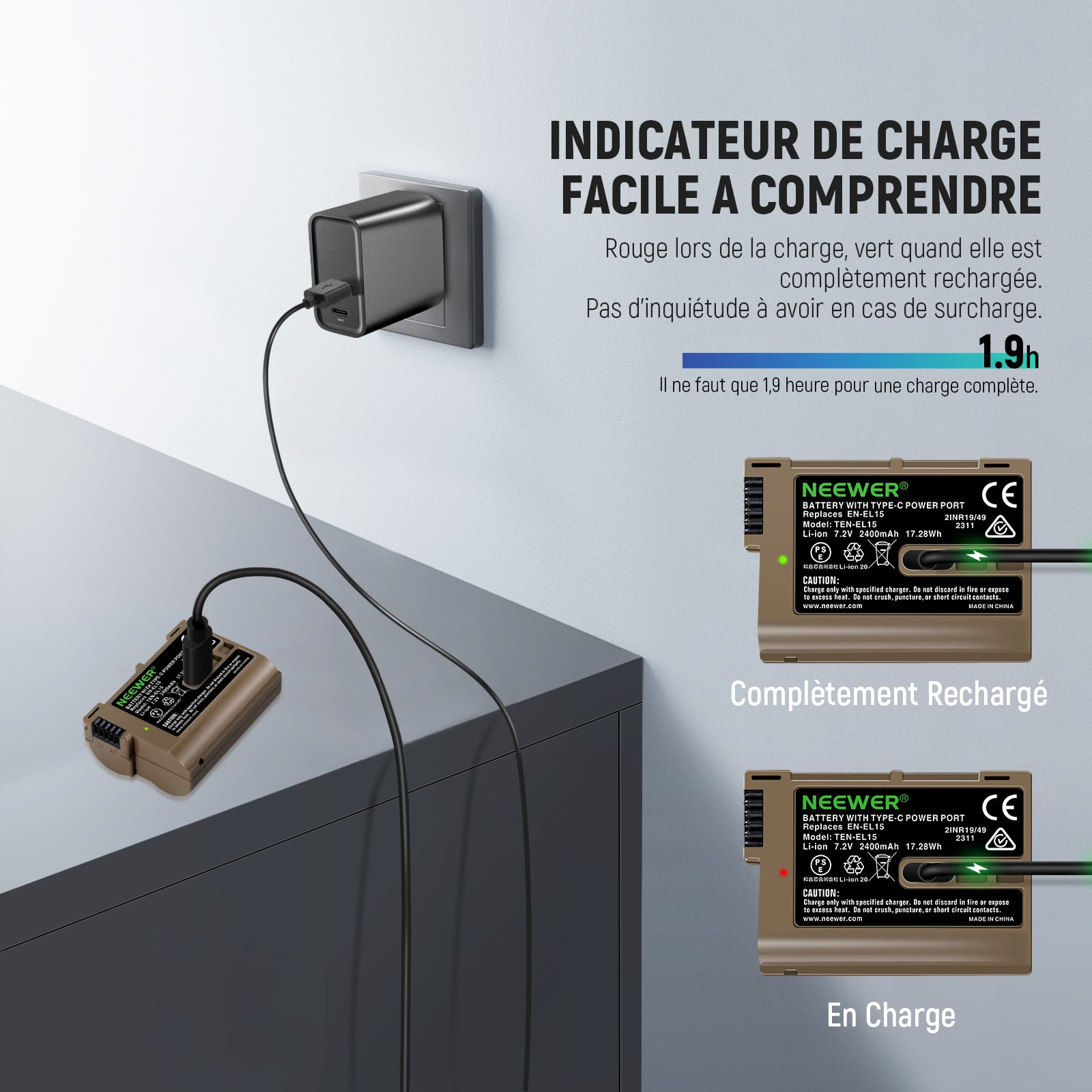 - 【Port USB-C intégré】 Dites adieu aux chargeurs de batterie dédiés. Avec un port de charge USB de type C intégré, cette batterie EN-EL15C de 2400mAh (7,2V 17,28Wh) peut recevoir directement l'énergie des adaptateurs de courant et des chargeurs portables via un câble USB de type C inclus