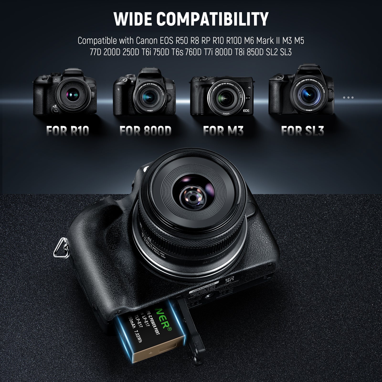 - 【Semi décodé pour une utilisation plus sûre】 Cette batterie est semi décodée. Aucune alerte ne s'affichera sur l'écran de votre appareil photo. Compatible avec EOS R50 R100 R10 RP R8 Rebel T8i/850D T7i/800D T6i/750D T6s/760D M5 M6 SL2 SL3, mais il n'affiche pas le niveau de la batterie.