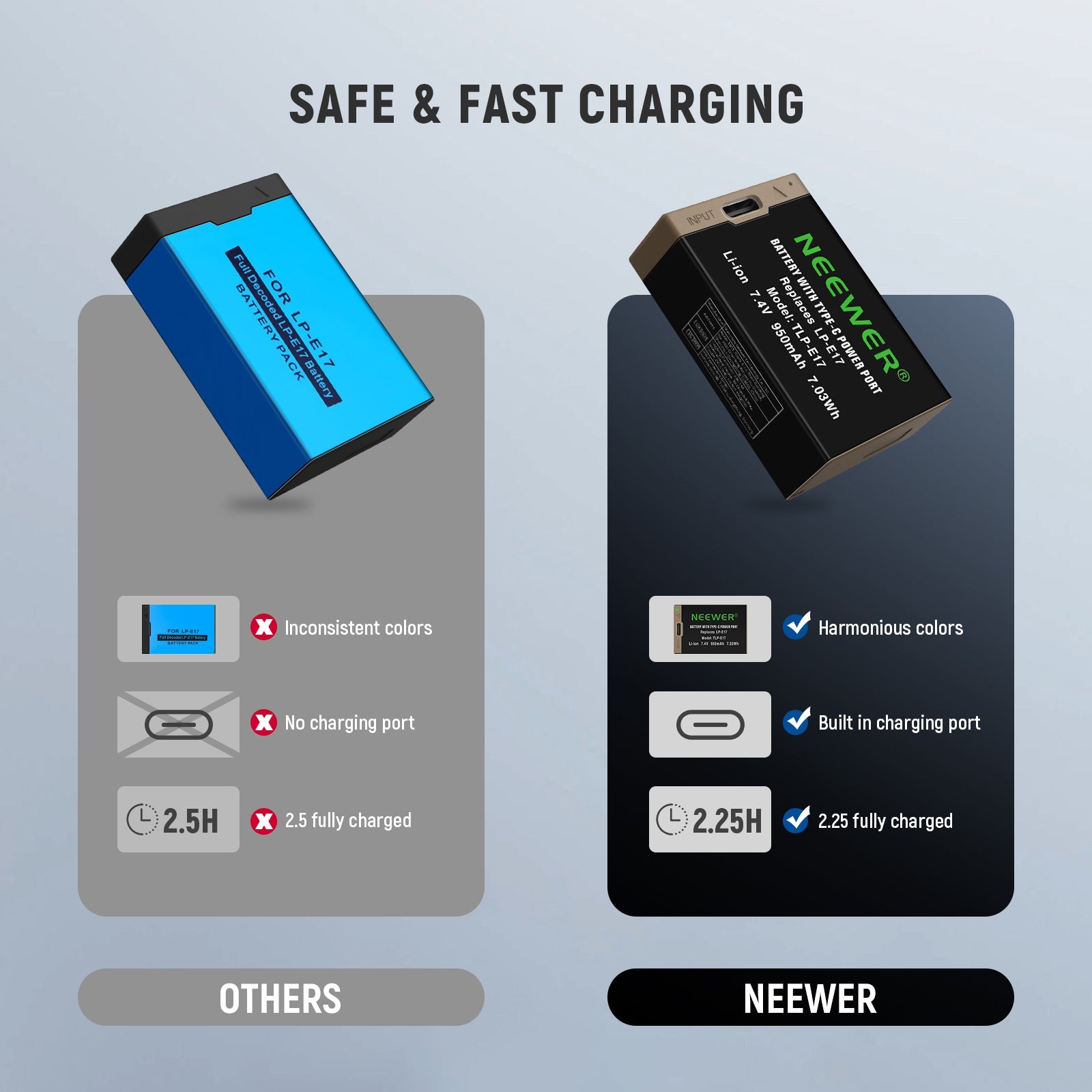 - 【2,3 Heures Vitesse de Chargement Plus Rapide】 Cette batterie peut être entièrement chargée en 2,3 heures avec un chargeur mural USB 5V 2A. Remarque : la charge rapide PD n'est pas prise en charge. Non compatible avec le chargeur de batterie LC-E17 d'origine.