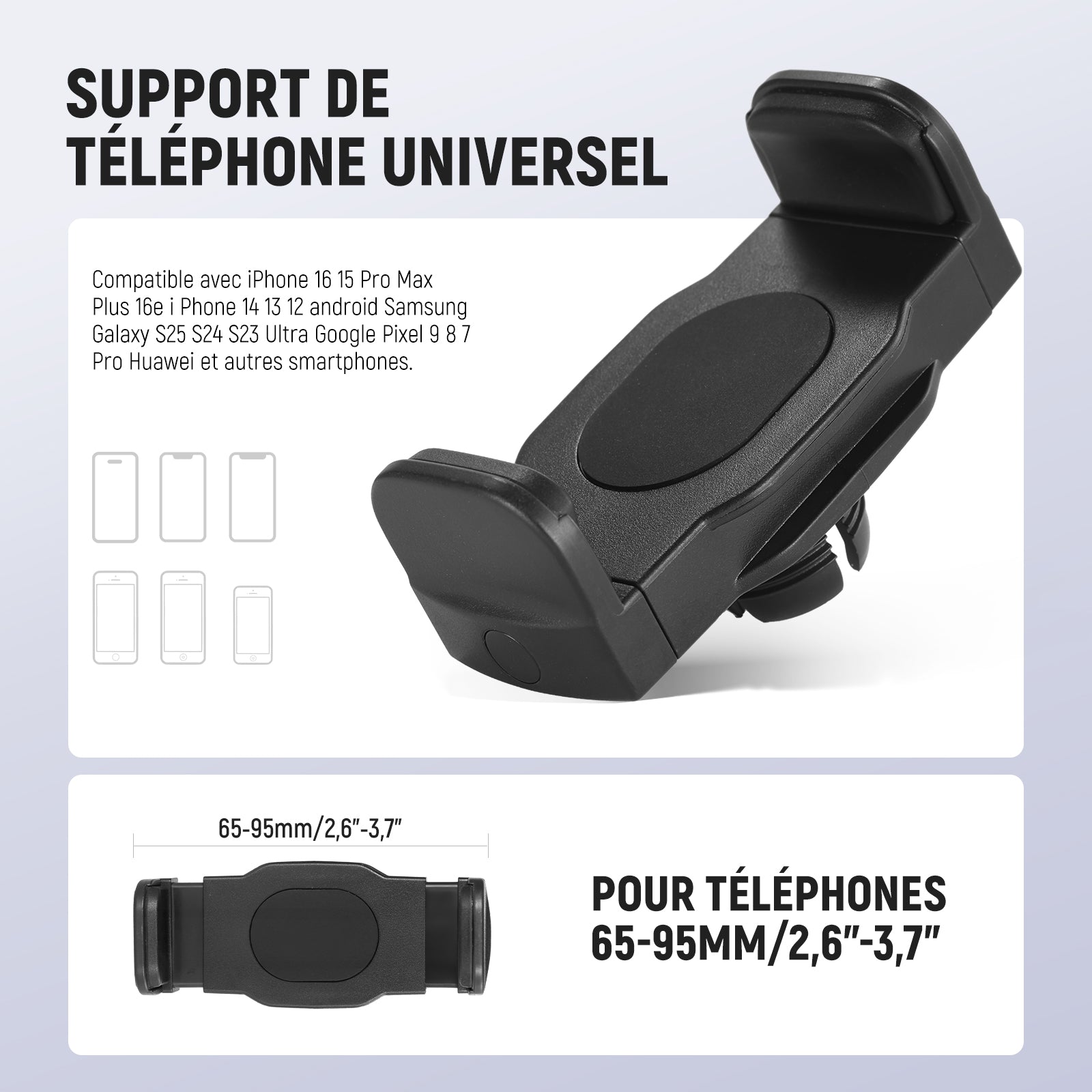- Support universel pour smartphone – Le support ajustable (65 à 95 mm) convient aux iPhone 16/15 Pro/Max/Plus/16e, iPhone 14/13/12, Samsung Galaxy S25/S24/S23 Ultra, Google Pixel 9/8/7 Pro, Huawei et autres smartphones, pour des prises de vue verticales ou horizontales. Les coussinets antidérapants protègent votre téléphone des rayures. Un accessoire essentiel pour les créateurs de contenu, idéal pour la photo, la vidéo et le streaming mobile.