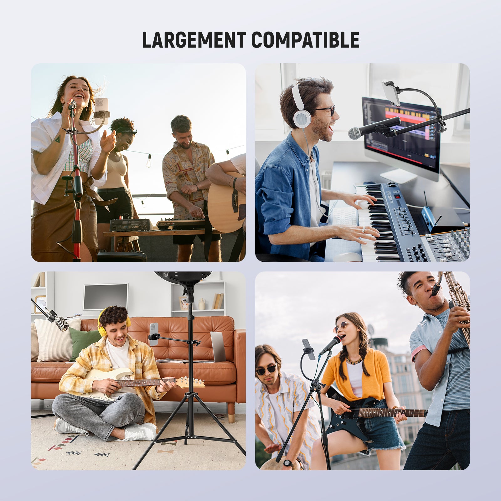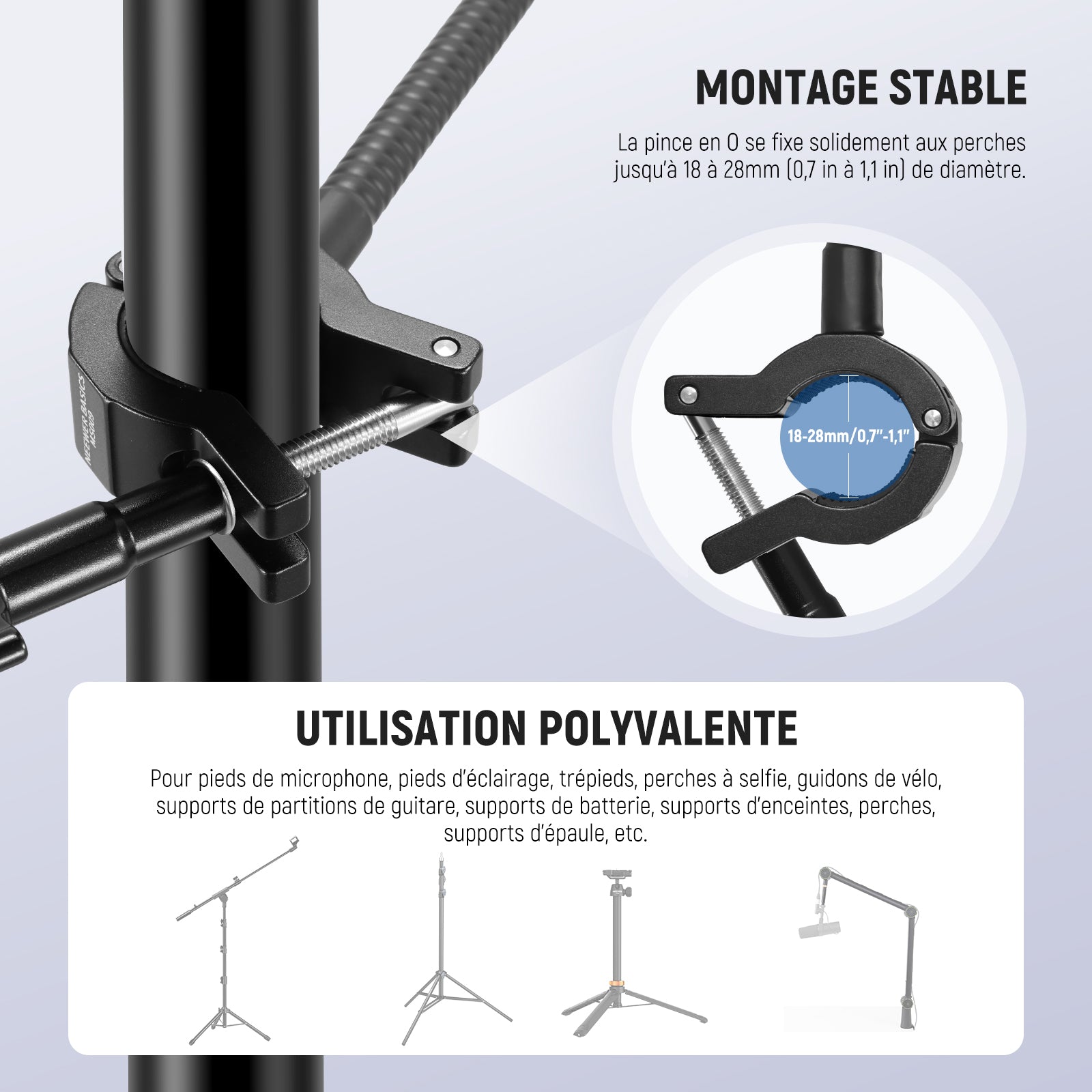 - Fixation stable et utilisation polyvalente – Grâce à sa pince en “O” compatible avec des tubes de 18 à 28 mm de diamètre, le support peut être fixé sur des pieds de micro, trépieds, perches, pieds d’éclairage, guidons de vélo, supports de partition, pieds d’enceintes, bras articulés, rigs d’épaule, et bien plus encore.