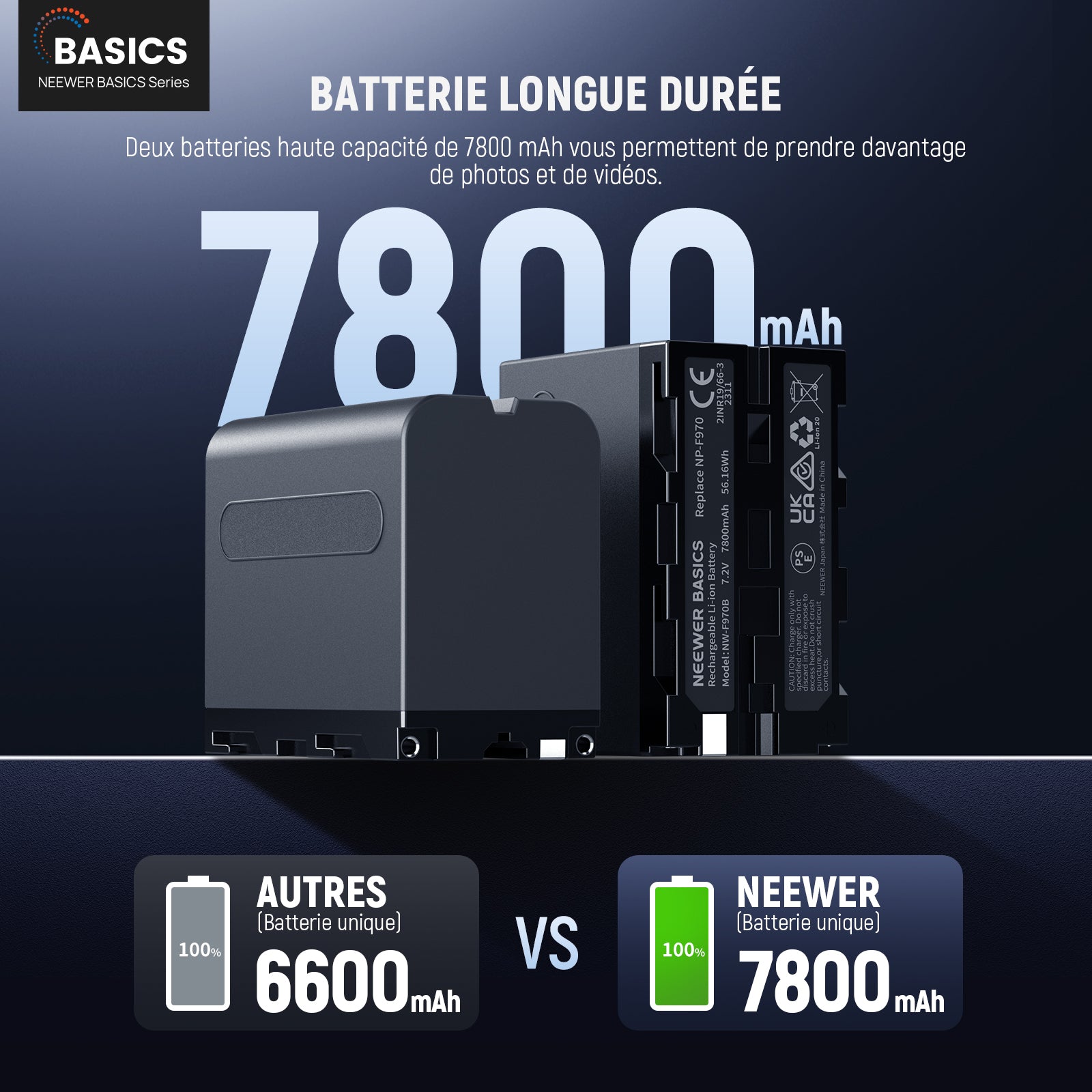 - 【2 Batteries de rechange 7800 mAh améliorées】 Chaque batterie lithium-ion NEEWER NP-F970 offre une capacité élevée de 7,2 V 7800 mAh (56,16 Wh), offrant une autonomie supérieure à celle des batteries NP-F standard comme alimentation de secours. Conçu avec des cellules haut de gamme pour une alimentation fiable et constante, pour immortaliser chaque instant.