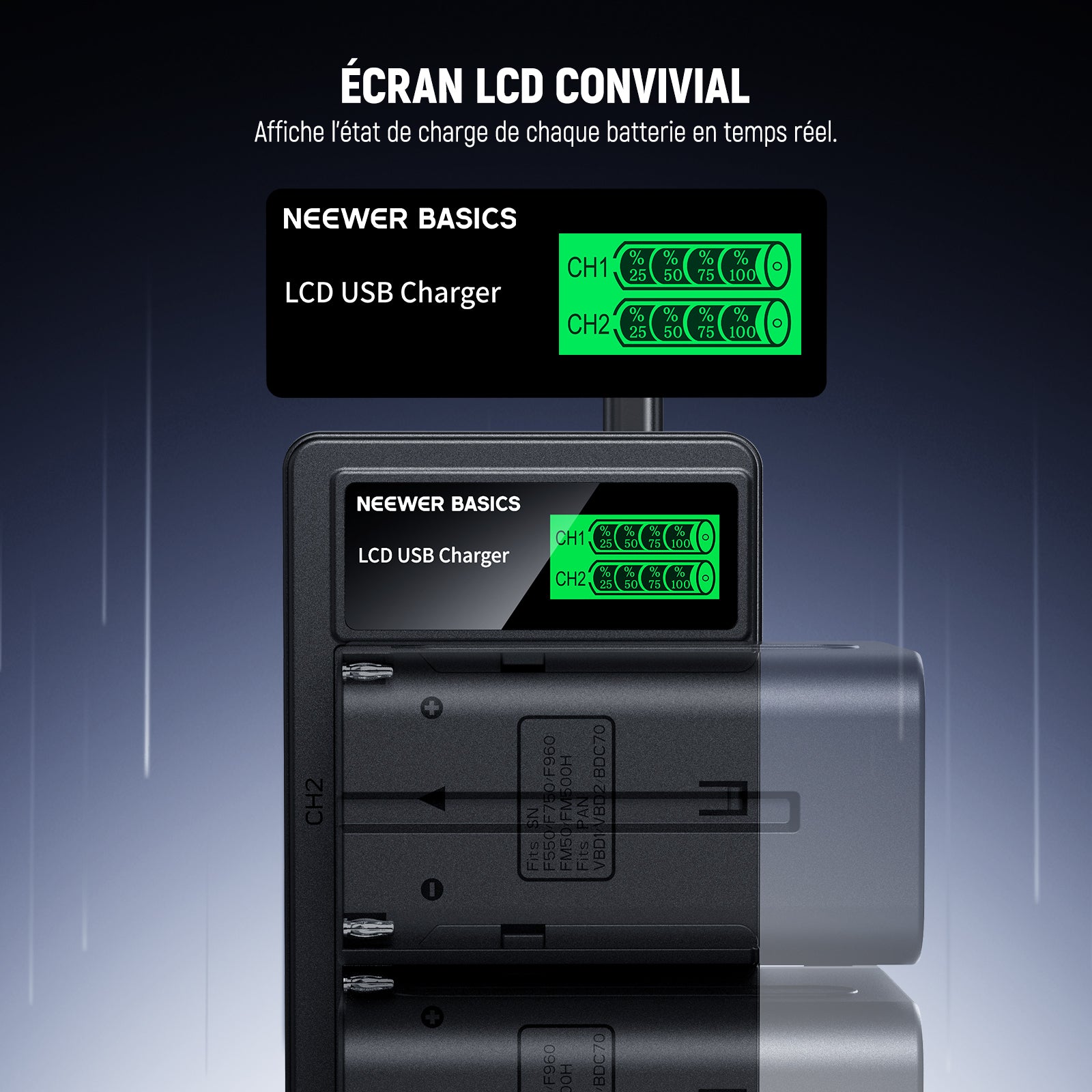 - 【Chargement double batterie】 Chargez simultanément deux batteries NPF compatibles en les plaçant correctement sur le chargeur. Le chargeur NP-F est doté d'un écran LCD qui affiche l'état de charge en temps réel.
