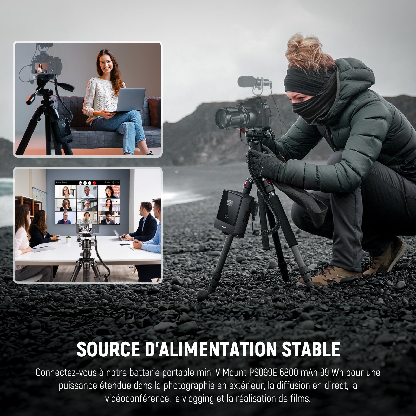- 【Énergie stable pour des enregistrements plus longs et plus sûrs】Adieu les pannes de câble et sauvegarde vos séquences critiques. Notre puce intelligente garantit une alimentation constante et stable pour votre création. Connectez-vous à notre mini batterie portable PS099E 6800 mAh 99 Wh à montage en V pour obtenir une énergie étendue dans la photographie en plein air, la diffusion en direct, la vidéoconférence, le vlogging et le tournage.