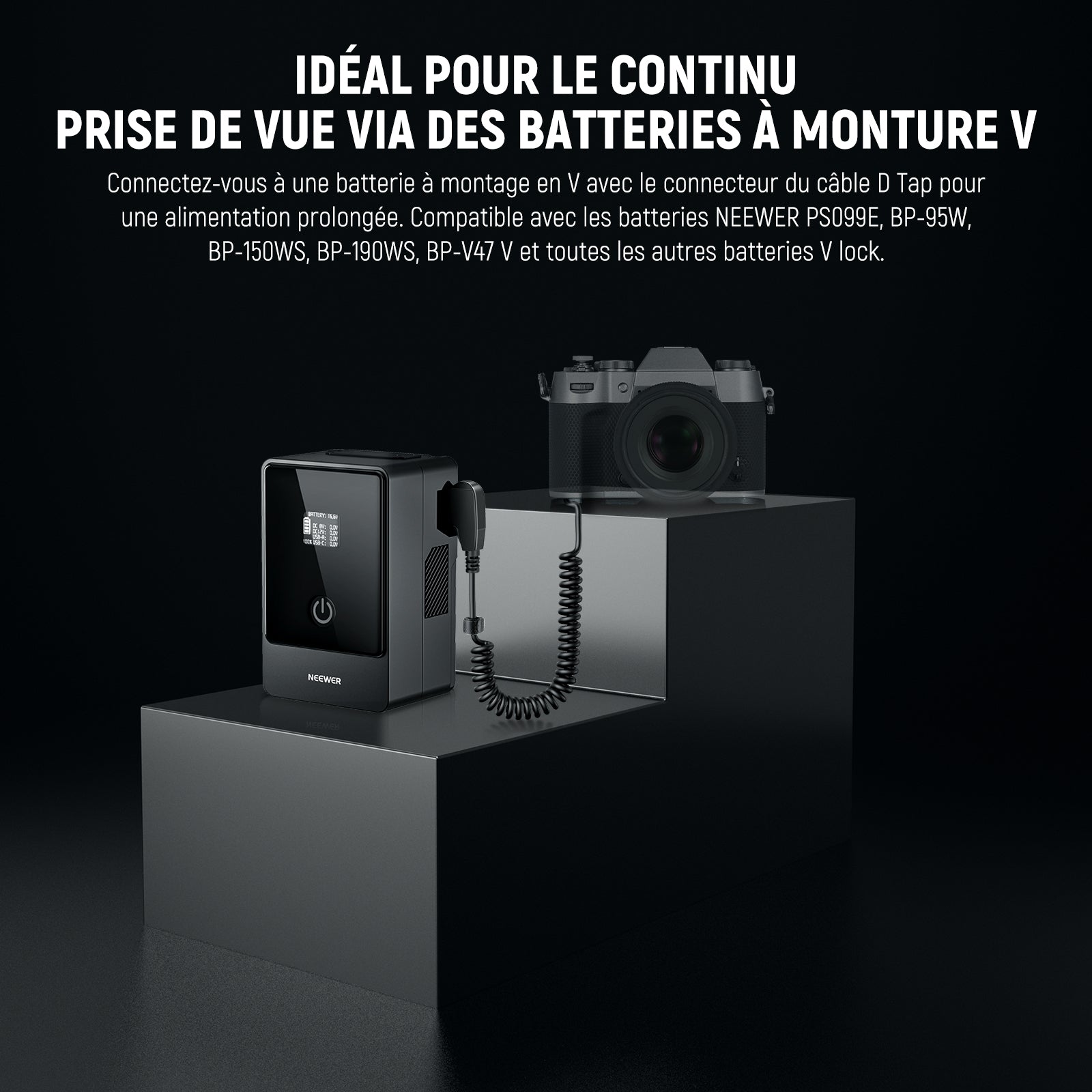- Idéal pour la prise de vue continue via des batteries de montage V : avec un connecteur de câble de robinet D, ce robinet D vers NP-W126S batterie factice peut fonctionner avec les batteries NEEWER PS099EP, PS099E, PS150E, PS050E et toutes les autres batteries de verrouillage V avec connecteur de robinet D. Compatible avec la série de batteries de montage en V SS. mallRig, compatible avec : les batteries de montage en V Sony BP-U65 BP-U68 BP-U100 BP-U90