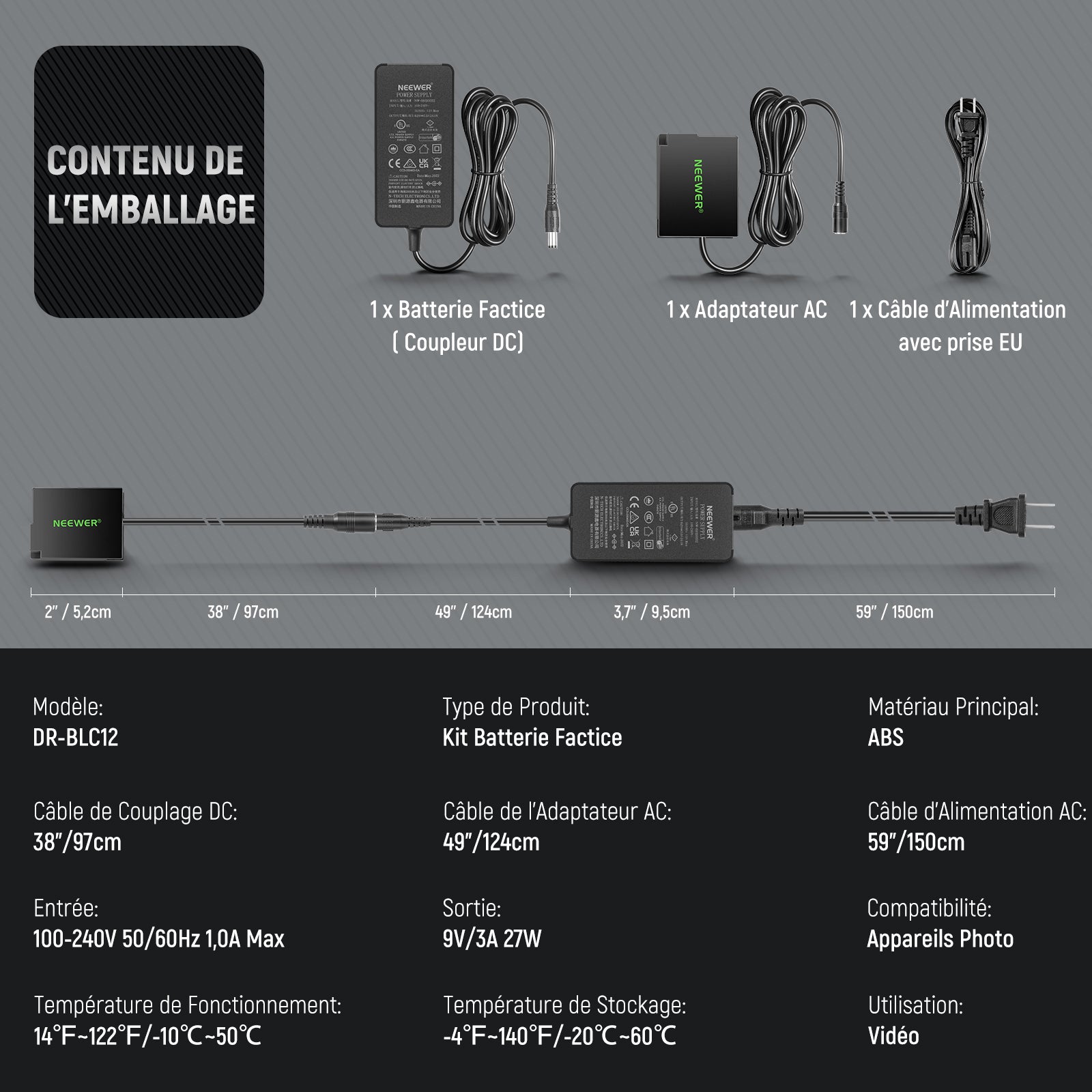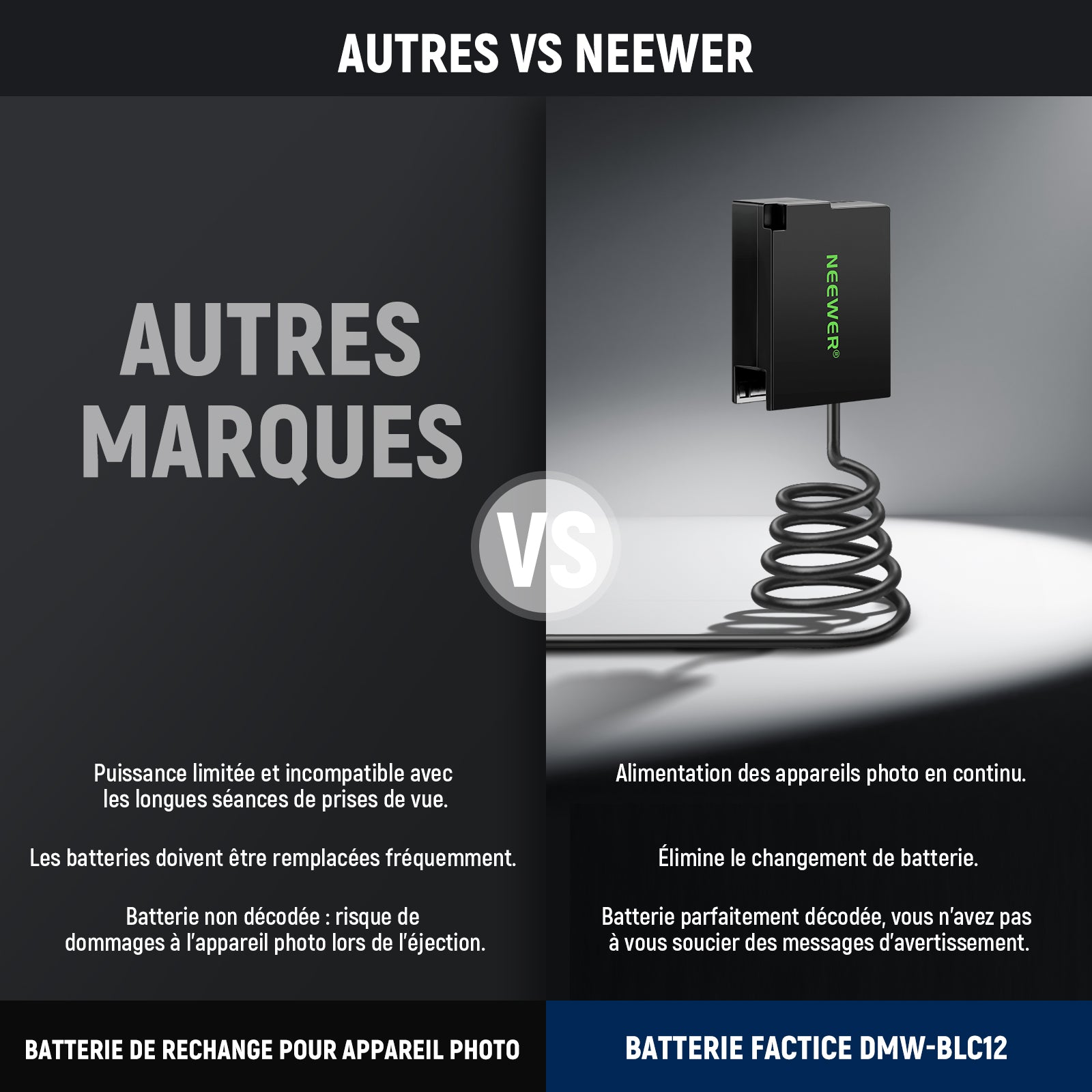 - 【Éliminez l'échange de batterie】 Plus de remplacement fréquent de la batterie! Le kit de batterie factice NEEWER DR-BLC12 remplace les batteries DMW-BLC12 DMW-BLC12E DMW-BLC12PP, assurant une alimentation continue à votre appareil photo pour vous permettre de filmer pendant de longues périodes sans interruption ni besoin de piles de rechange