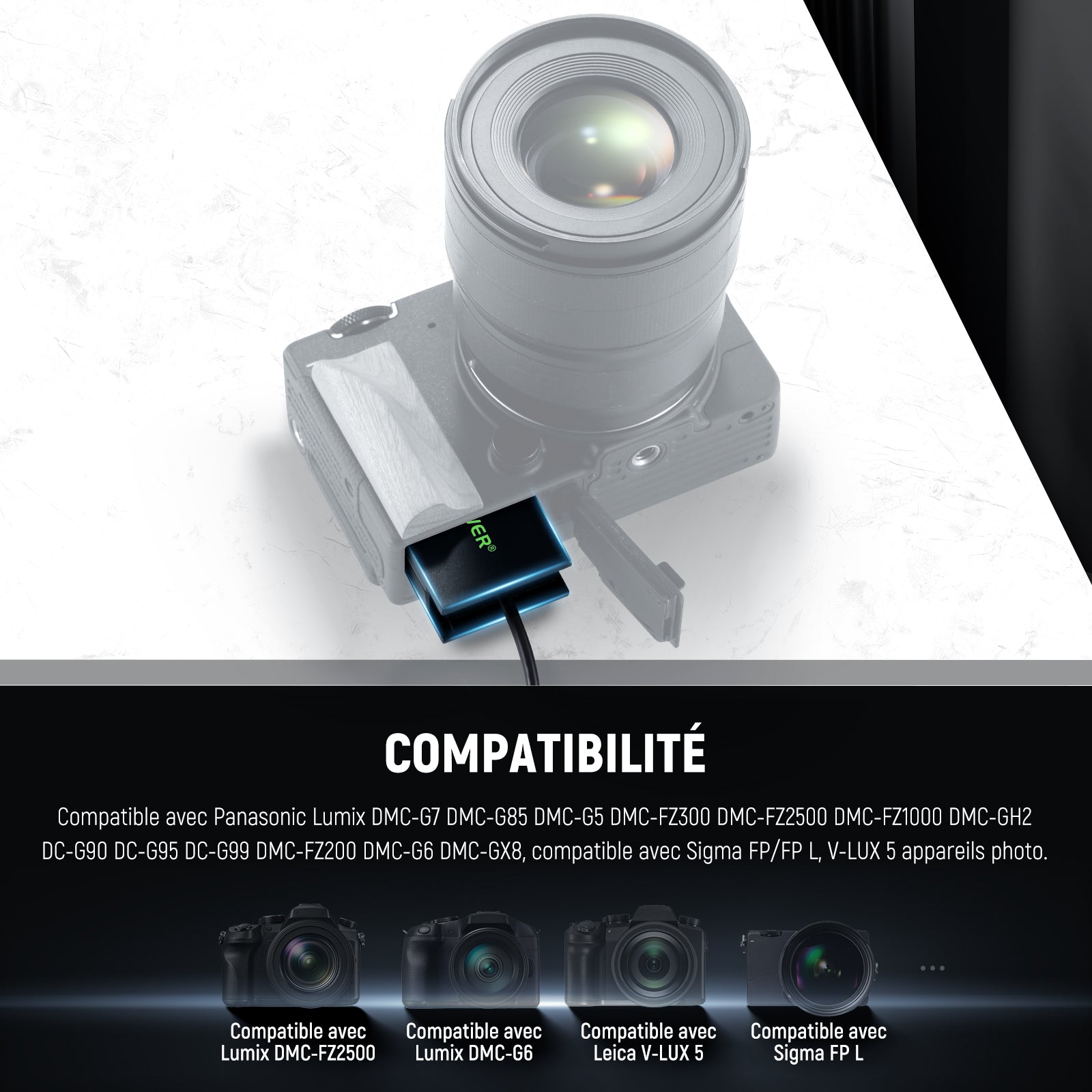 - 【Modèles compatibles】 ce kit de coupleur adaptateur secteur est compatible avec Panasonic LumixDMC-G7 DMC-G85 DMC-G5 DMC-FZ300 DMC-FZ2500 DMC-FZ1000 DMC-GH2 DC-G90 DC-G95 DC-G99 DMC-FZ200 DMC-G6 DMC-GX8, compatible avec Sigma FP/FP L, V-LUX 5 caméras