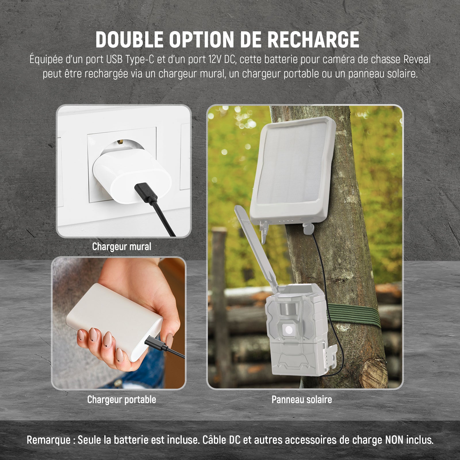 - 【Double option de recharge】 Équipée d'un port USB Type-C et d'un port 12V DC, cette batterie pour caméra de chasse Reveal se recharge via un chargeur mural, un chargeur portable ou un panneau solaire. Le port USB-C prend en charge la charge rapide QC 3.0 5A/3V, garantissant une recharge rapide pour vos longues aventures en plein air. Un câble USB A vers USB C est inclus.