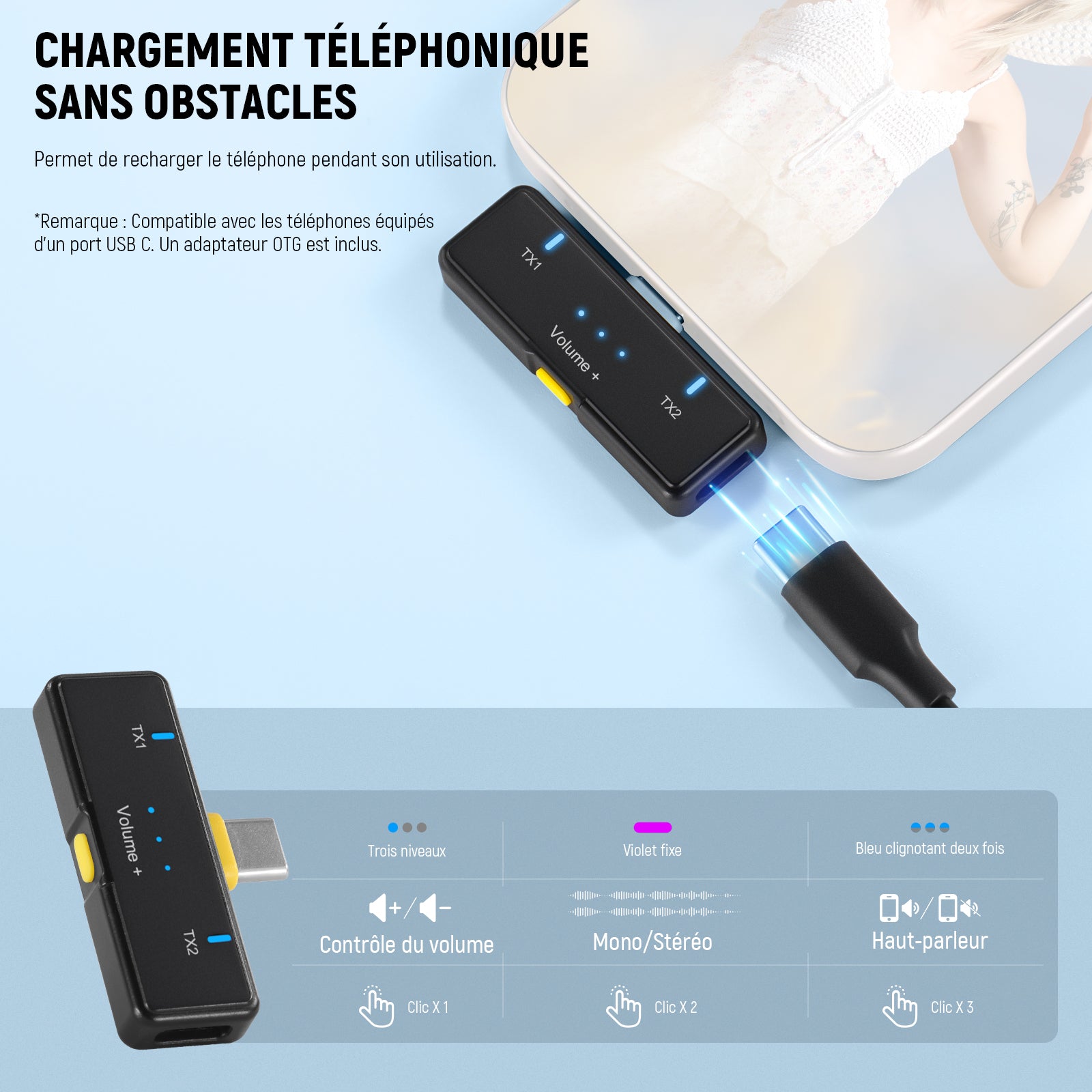 - 【Ensemble de microphones-cravates sans fil à pince】 comprend un récepteur (RX), deux émetteurs-cravates (TX) et un adaptateur OTG. Plug and play, le récepteur est compatible avec iPhone 16 Pro Max, iPad, Mac, Android, tablettes, PC, ordinateurs USB C et ordinateurs portables équipés de connecteurs USB C ou iOS. Il est également compatible avec DJI Insta360 caméras d'action (non compatible avec GoPro). Certains modèles de téléphones nécessitent l'activation de la fonction OTG.