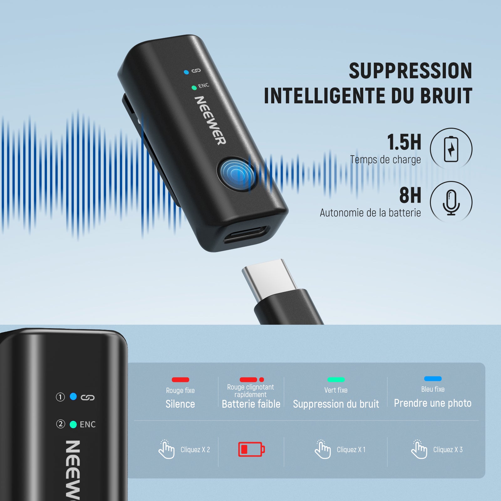 - 【Portée de 100m et autonomie de 8 h】 La technologie sans fil 2,4 G assure une transmission fluide jusqu'à 100 m avec une faible latence de 26 ms dans les espaces ouverts et dégagés. Chaque émetteur USB-C se recharge entièrement en 1,5 heure et offre jusqu'à 8 heures d'autonomie. Microphones sans fil idéaux pour le vlog, le streaming en direct, les interviews, les podcasts, la diffusion télévisée, les visioconférences, les appels Zoom, etc.