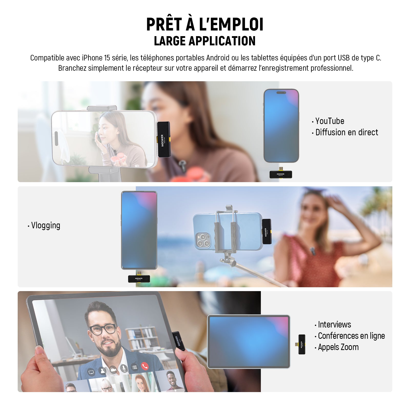 - 【Pratique et portable】 Le microphone cravate sans fil est prêt à l'emploi. Branchez simplement le RX sur votre téléphone portable ou d'autres appareils dotés d'une interface USB de type C. Chaque micro ne pèse que 8g, ce qui n'affecte pas l'apparence du collier. Compact et léger pour le stockage et l'enregistrement sonore en extérieur. Remarque : certains smartphones peuvent nécessiter l'activation de la fonction OTG dans les paramètres