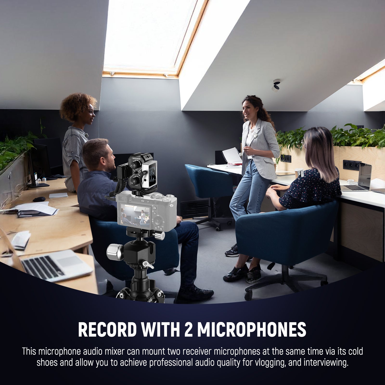 • Record with 2 Microphones- This small microphone audio mixer can mount two microphones at the same time via its cold shoes and allow you to achieve professional and flawless audio quality for filming, vlogging, podcast, and interviewing