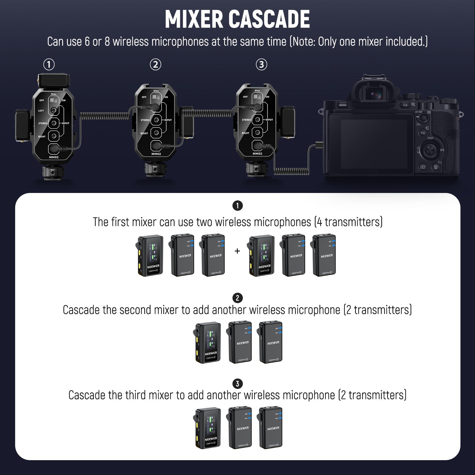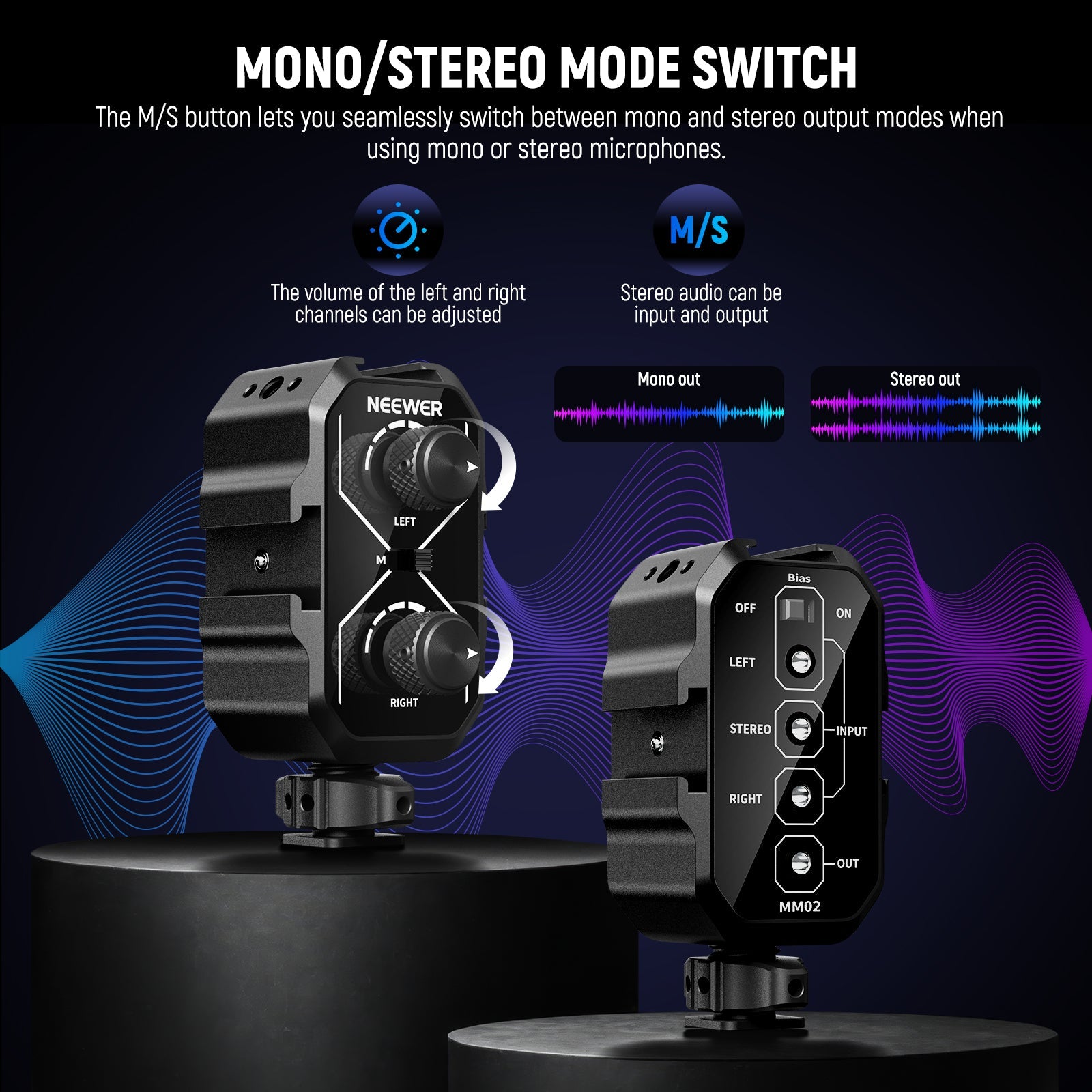 • Suitable for Different Mics(MM02)- An ideal solution for mounting two compact microphones and sound mixing, this mixer lets you effortlessly mount and control two microphones or wireless receivers. Not only can it work with battery powered microphones, it also works with microphones without built in batteries, such as NEEWER KM17. Note: When using a microphone without built in power source, please connect it to the left channel input and enable bias voltage switch