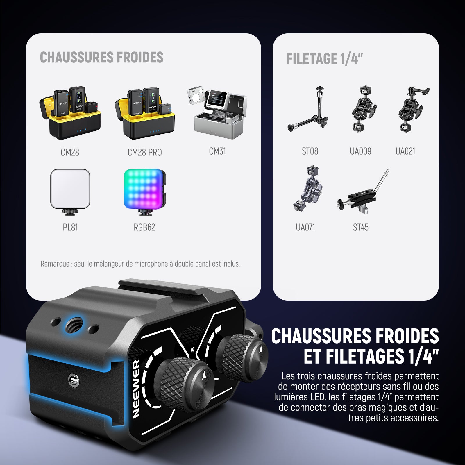• 【Chaussures froides et filetages 1/4"】 Fixez mixeur à votre Caméra via un adaptateur de griffe froide et fixez-le avec molette.Trois supports de griffe froide supplémentaires permettent montage de récepteurs sans fil (NEEWER CM31,CM28,CM28 PRO,et plus)ou de lumières LED (NEEWER PL81,RGB62).Filetages 1/4" peuvent connecter des bras magiques et d'autres petits équipements ou accessoires de vidéographie photographique comme élément essentiel du créateur de contenu et indispensable pour influenceurs