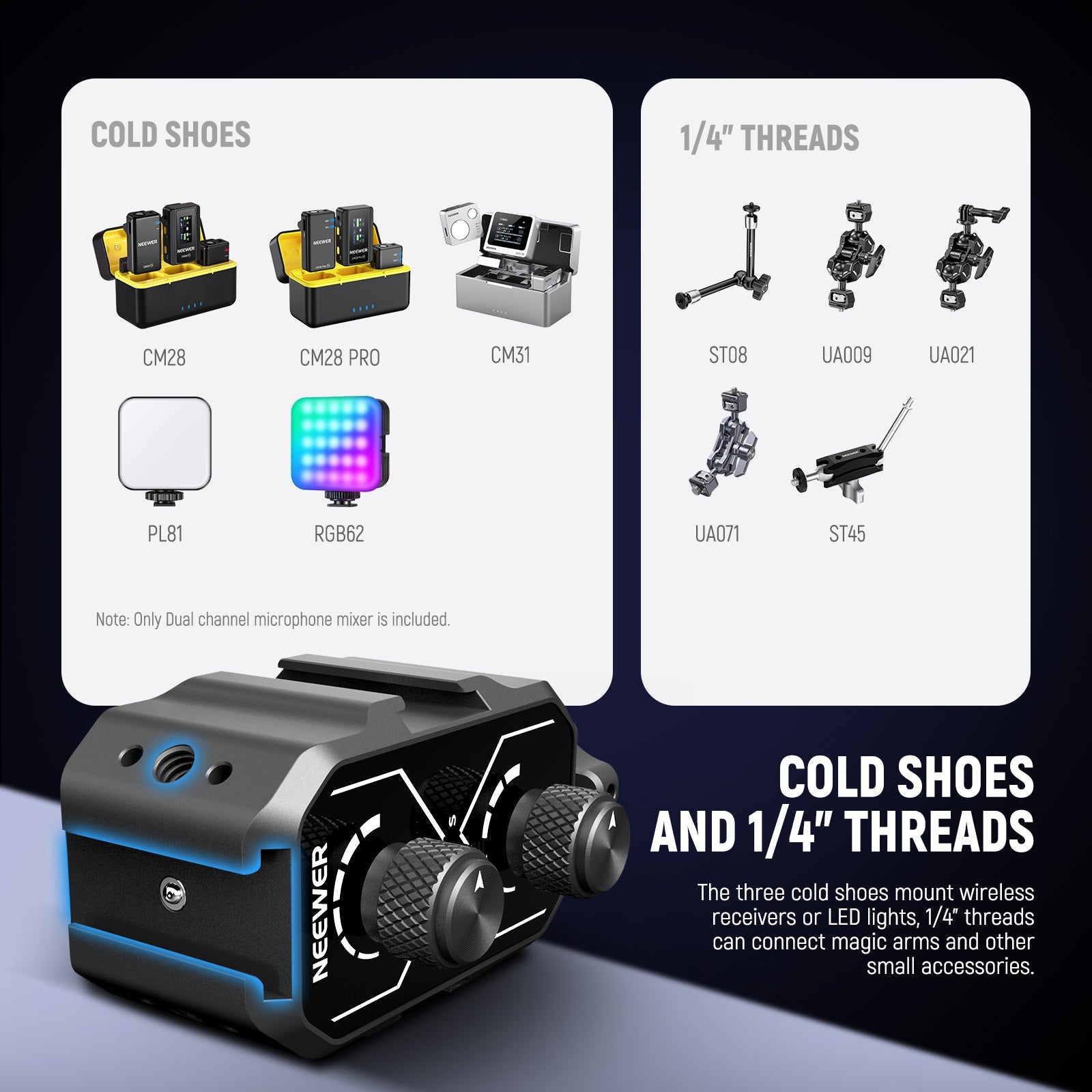 • Cold Shoes & 1/4" Threads- Attach the mixer to your camera via a cold shoe adapter and secure with the thumb wheel. The three additional cold shoe brackets allow mounting of wireless receivers (NEEWER CM31, CM28, CM28 PRO, and more) or LED lights (NEEWER PL81, RGB62). 1/4" threads can connect magic arms and other small photography gear or accessories as content creator essential and influencer must have