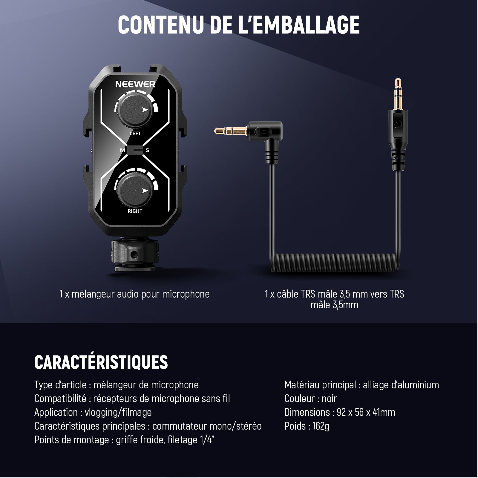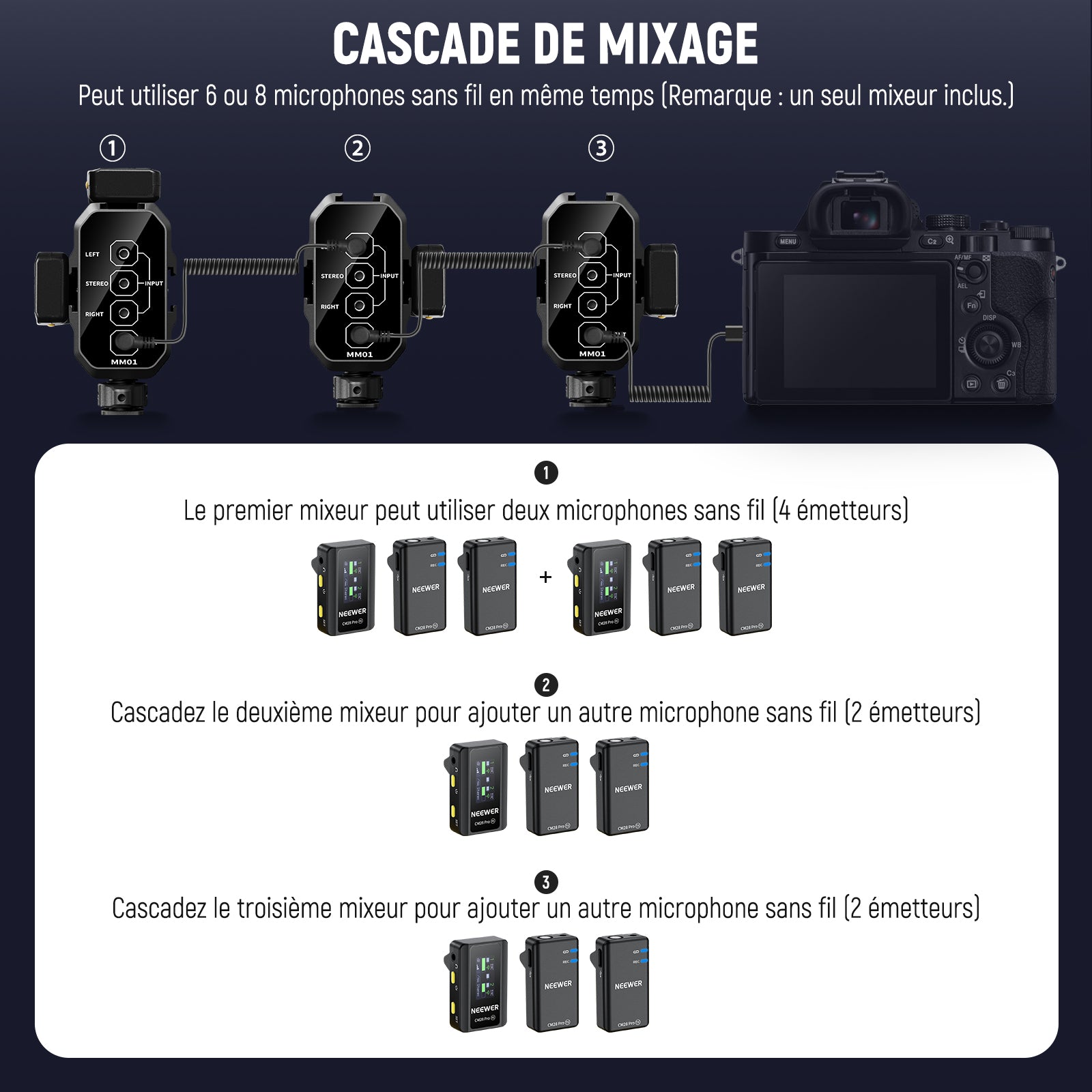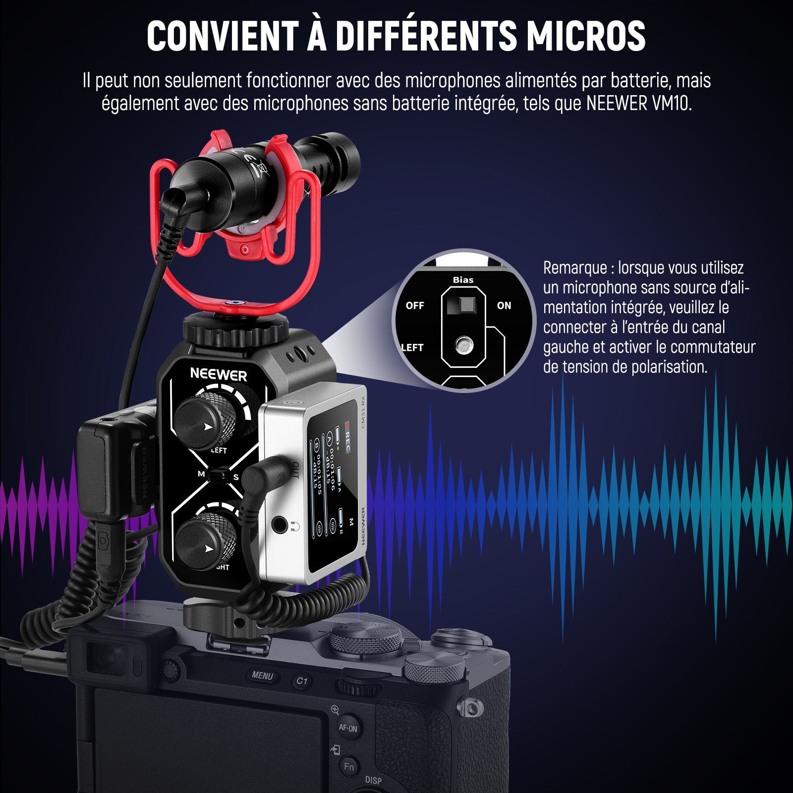 • Adapté à différents micros (MM02)- Une solution idéale pour le montage de deux microphones compacts et le mixage audio, ce mixeur vous permet d'installer et de contrôler sans effort deux microphones ou récepteurs sans fil. Non seulement il peut fonctionner avec des microphones alimentés par batterie, mais il fonctionne également avec des microphones sans batterie intégrée, tels que le NEEWER KM17. Remarque : lors de l'utilisation d'un microphone sans source d'alimentation intégrée, veuillez le connecter à l'entrée du canal gauche et activer le commutateur de tension de polarisation