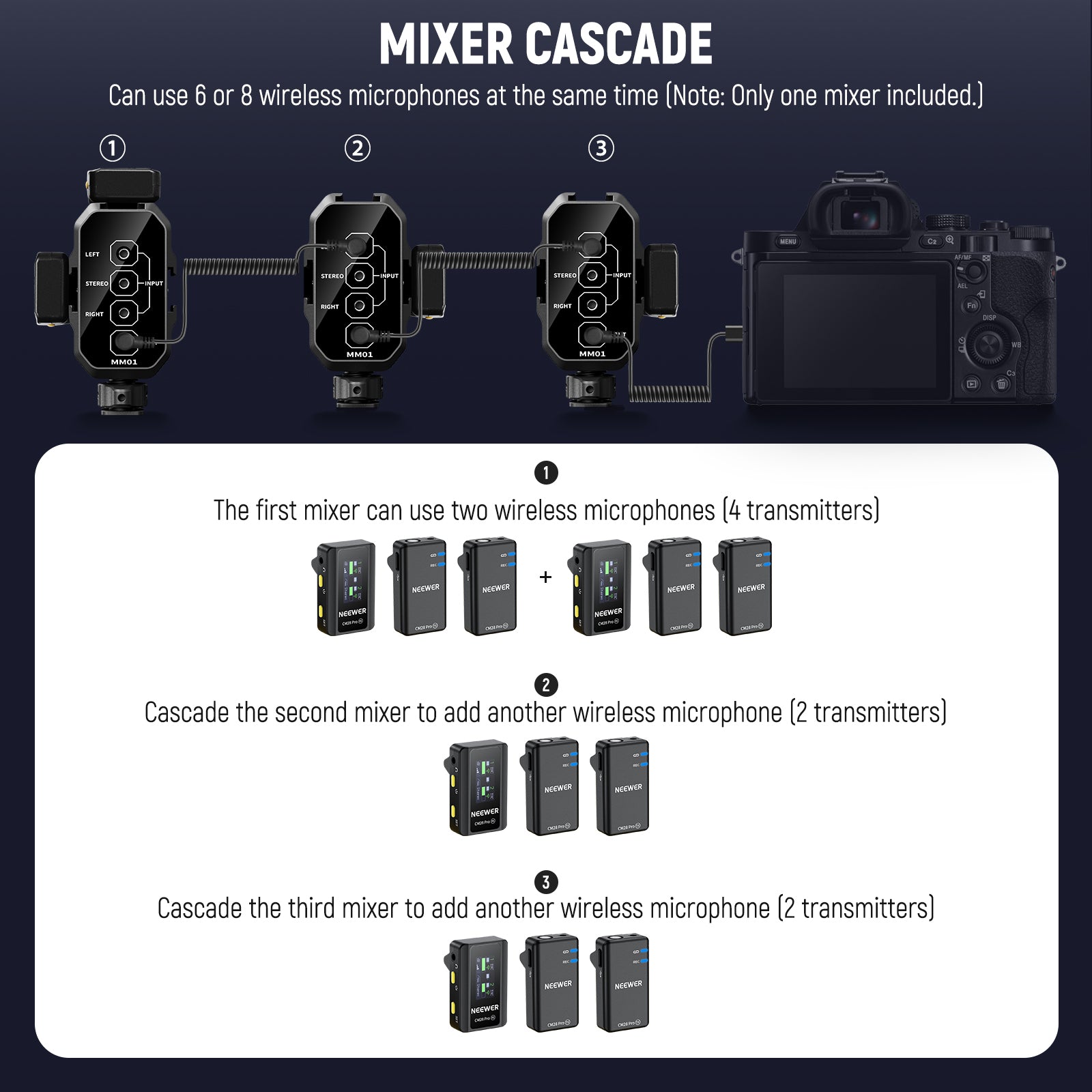 • Battery Powered Mics Only(MM01)- An ideal solution for mounting two compact microphones and sound mixing, this mixer lets you effortlessly mount and control two microphones or wireless receivers. Since it does not require batteries or external power supplies, it only works with battery powered microphones