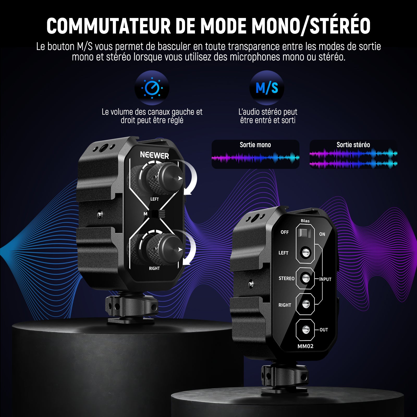 • 【Commutateur de mode mono/stéréo】 Deux cadrans contrôlent les gains sur les canaux gauche et droit. Le bouton M/S vous permet de basculer en toute transparence entre les modes de sortie mono et stéréo : réglez sur M lorsque vous utilisez un seul canal et sur S lorsque vous utilisez les deux