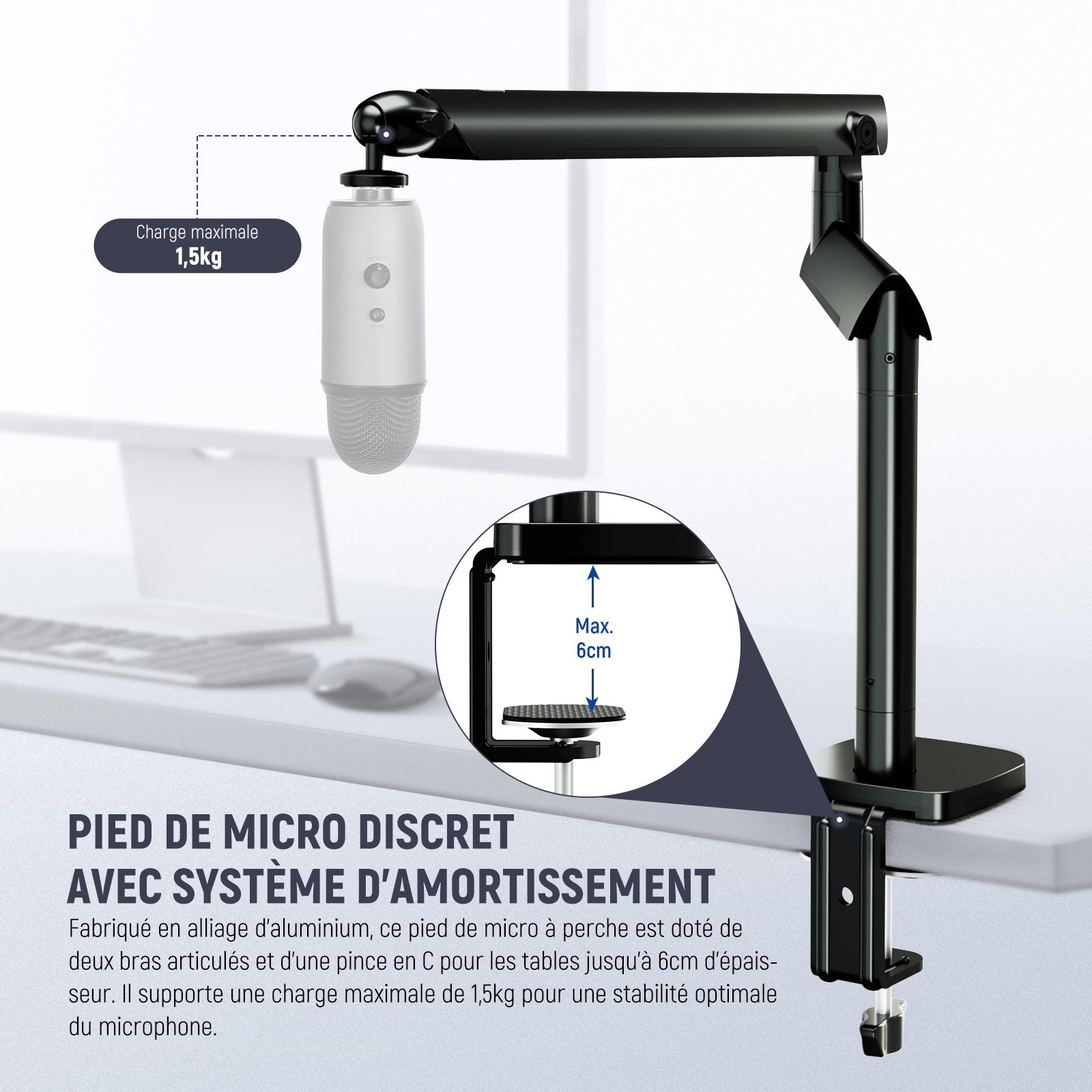 - Support de micro discret avec système d'amortissement : fabriqué en alliage d'aluminium, le support de microphone à perche dispose de deux bras articulés et d'une pince en C pour les tables jusqu'à 6 cm d'épaisseur. Le système d'amortissement avancé permet un positionnement rapide et stable, supportant jusqu'à 1,5 kg, assurant une excellente absorption des chocs et stabilité. Facile à plier les bras du micro sous un moniteur de bureau lorsque vous ne vous en servez pas