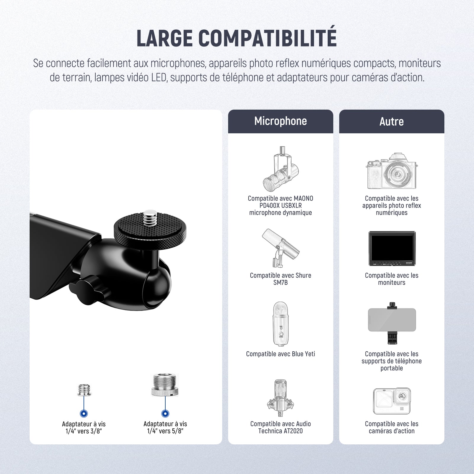 - Large compatibilité: Avec une vis supérieure de 1/4", un adaptateur de vis de 1/4" à 3/8" et un adaptateur de vis de 1/4" à 5/8", le bras de microphone est compatible avec MAONO PD400X USB/XLR Blue Yeti Shure SM7B Audio Technica AT2020 HyperX QuadCast Fifine K669B, etc. Fixez plus d'accessoires au pied de micro, configuration d'équipement idéale pour les jeux, le streaming en direct, le podcast en studio, le chant, l'enregistrement vidéo, les appels Zoom, le podcasting et la création musicale