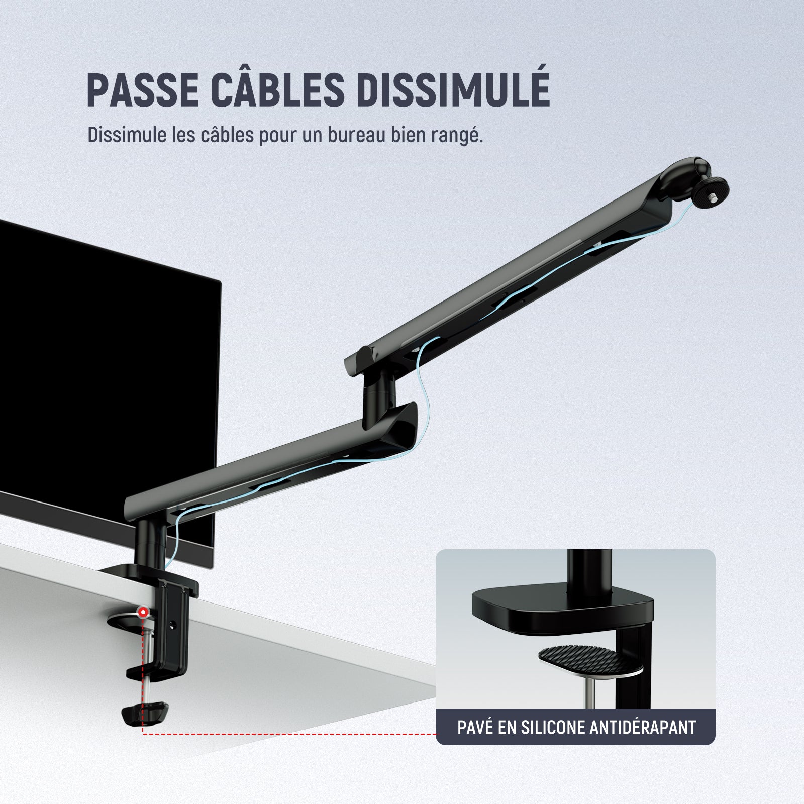 - Canal de câble caché : les bras de la perche de micro de table disposent de canaux de câble intégrés, permettant un rangement discret des câbles de microphone et favorisant un espace de travail bien rangé et organisé. En outre, la pince de serrage en C est livrée avec des coussinets en silicone antidérapants, empêchant efficacement les rayures sur vos bureaux