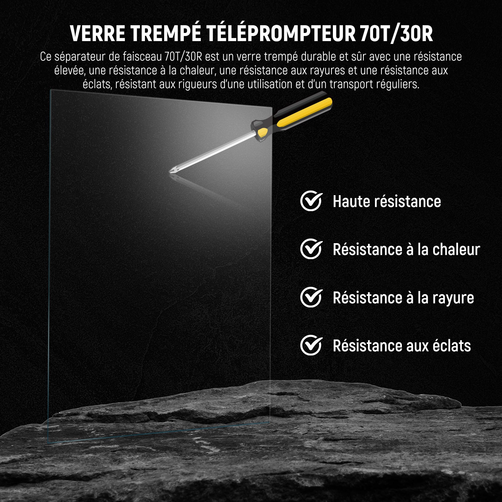 - 【Qualité d'image impeccable】 ce séparateur de faisceau offre 70 % de transparence et 30 % de réflexion avec des revêtements particuliers, garantissant une image haute définition, sans distorsion et sans images fantômes. Le revêtement antireflet garantit également que le verre reste neutre pour préserver les vraies couleurs de votre contenu, ce qui le rend parfait pour le téléprompt