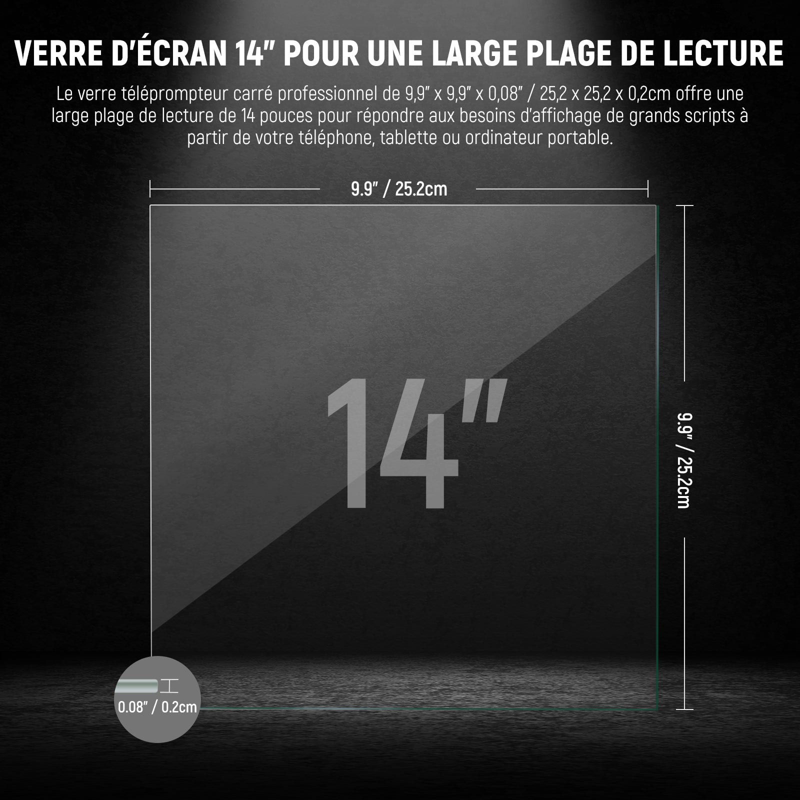 - 【Verre d'affichage de 14 pouces pour une large plage de lecture】le verre de téléprompteur cube professionnel NEEWER de 9,9" x 9,9" x 0,8"/252 x 252 x 2 mm offre une large plage de lecture de 14 pouces pour répondre aux besoins d'affichage de grands scripts depuis votre téléphone, tablette, ou ordinateur portable