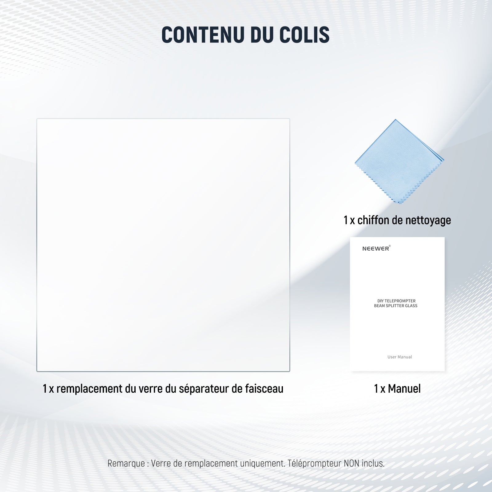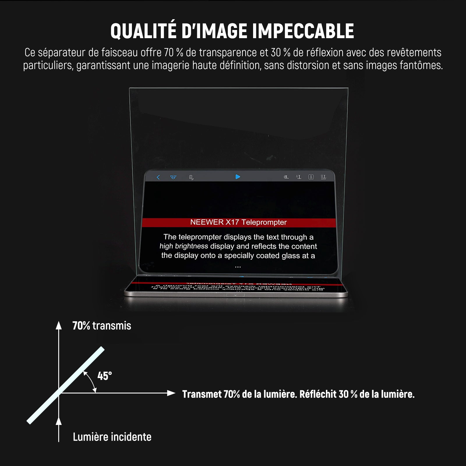 - 【Verre téléprompteur professionnel】Séparateur de faisceau cubique haute définition NEEWER est construit avec savoir-faire ultime,parfait pour téléprompteur à utiliser dans production vidéo,éducation,apprentissage en ligne,événement en direct,salle de rédaction traditionnelle,studio de télévision,etc,permettant flux constant d'information tout en se concentrant sur l'engagement ou l'interaction avec public.Remarque:verre séparateur de faisceau uniquement.Non compatible avec téléprompteurs NEEWER
