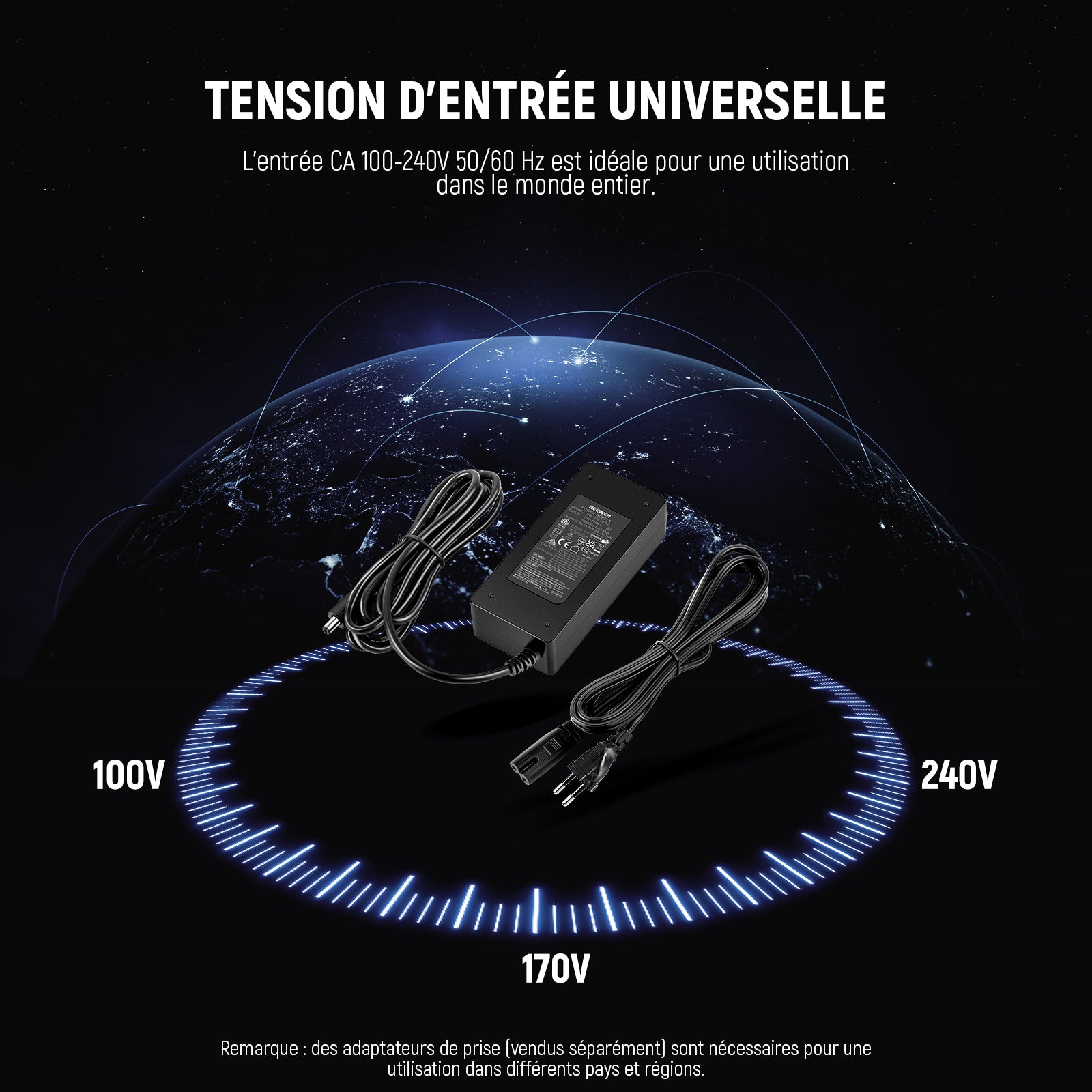 - 【Tension d'entrée universelle】 L'entrée CA 100-240V 50/60 Hz est idéale pour une utilisation mondiale. Remarque : des adaptateurs de prise (vendus séparément) sont nécessaires pour une utilisation dans différents pays et régions