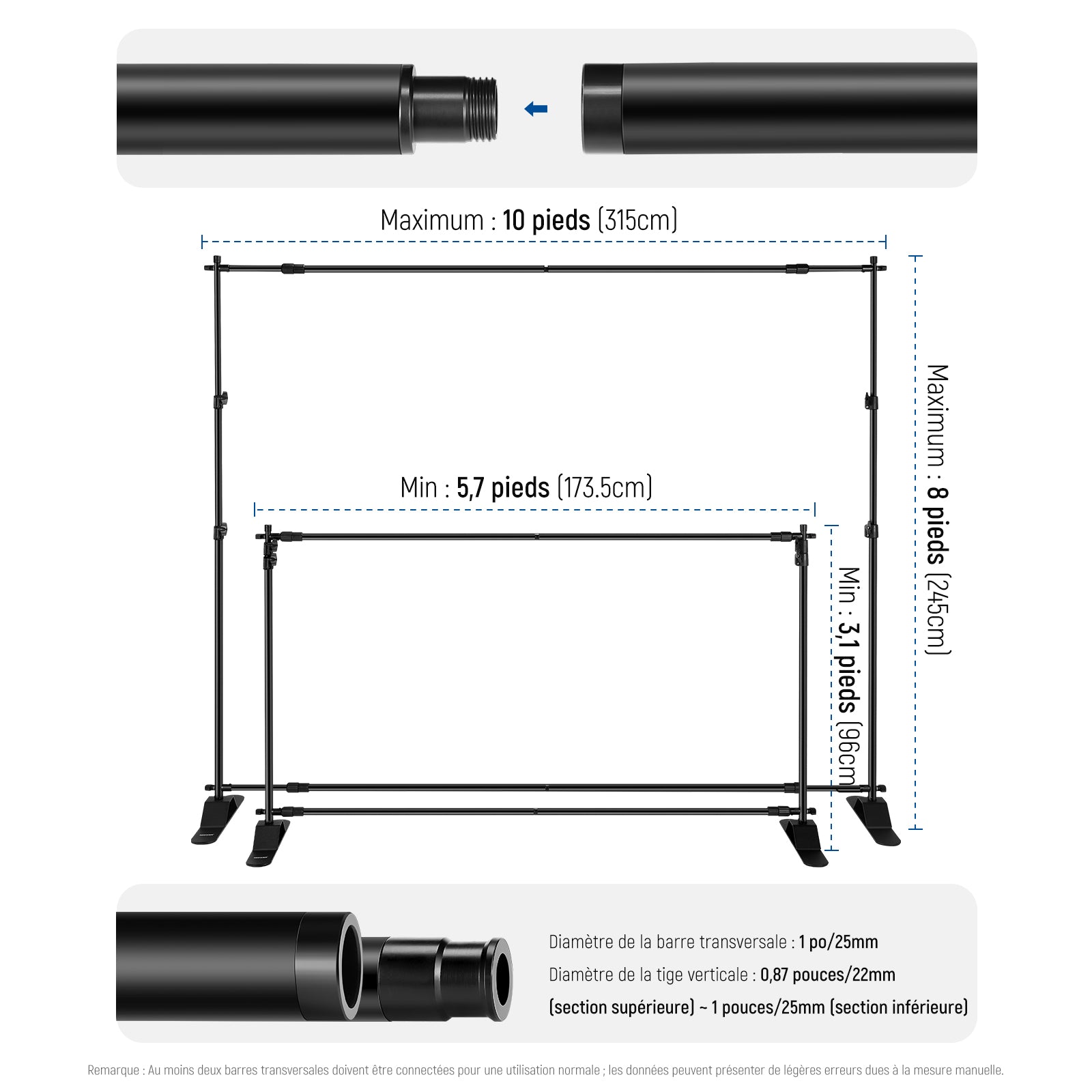• 【Hauteur et largeur personnalisables】 Avec quatre barres transversales amovibles (deux supérieures, deux inférieures) et deux rallonges télescopiques, ce support de toile de fond réglable ajuste facilement la largeur de 5,9 pieds/180 cm à 9,8 pieds/300cm en ajoutant ou en retirant des barres transversales, et réglez-le à votre guise. hauteur préférée de 3,2 pieds/98cm à 8 pieds/245cm avec une simple torsion