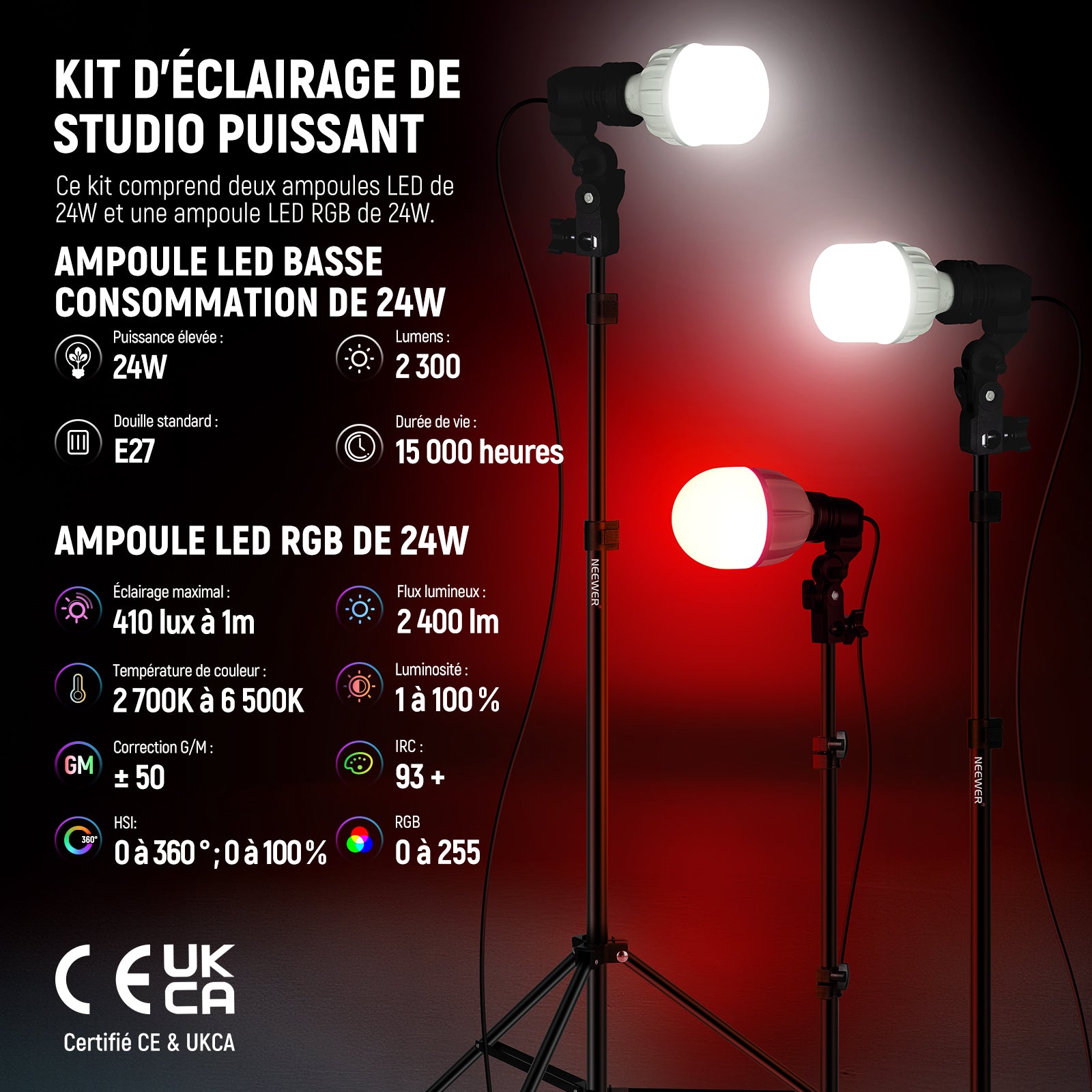 • 【Kit d'éclairage de studio puissant】 Ce kit propose deux ampoules LED 24W et une ampoule LED RGB 26W. Chaque ampoule LED de 24W équivaut à une ampoule à incandescence de 200W pour un rendement lumineux brillant et constant, avec une température de couleur de 5 700K pour une lumière naturelle et équilibrée pour vos photos. L'ampoule LED RGB 26W contrôlée par application comprend 9 effets, 400 lux/m, température de couleur 2 700K-6 500K, CRI 93+ élevé et TLCI 98+, créant des scènes spectaculaires